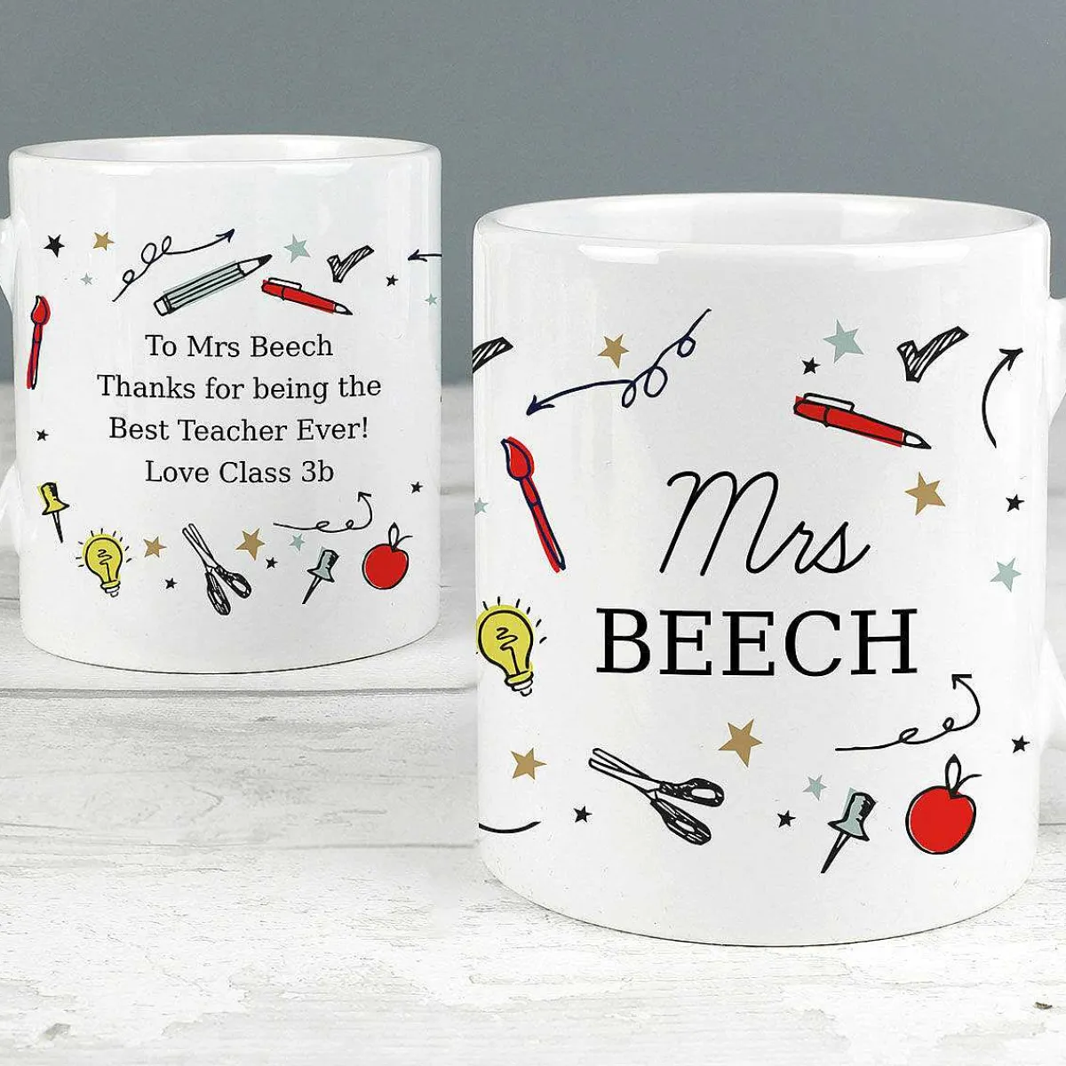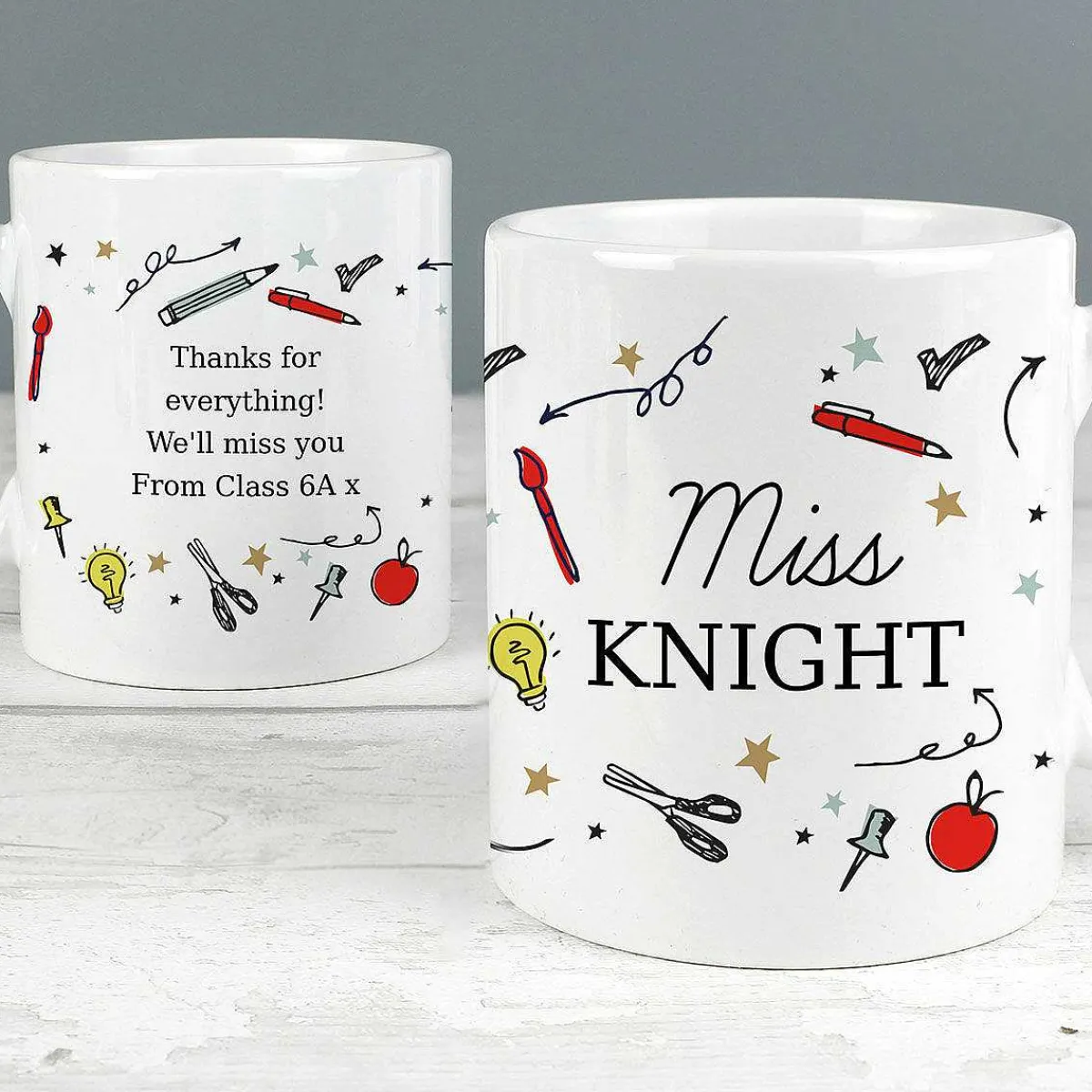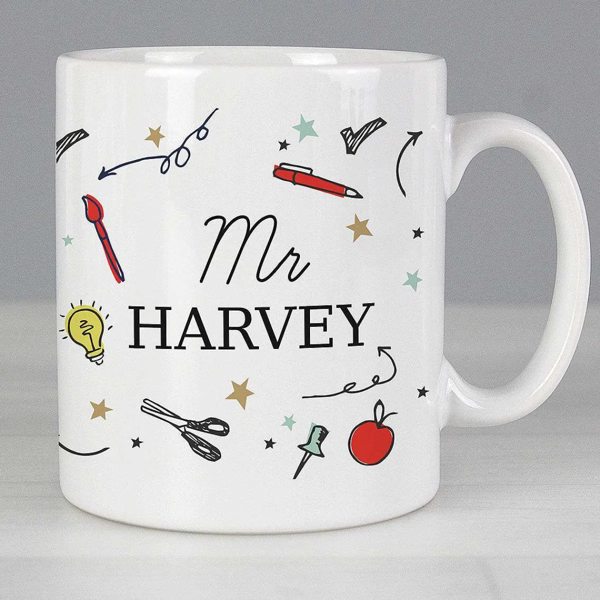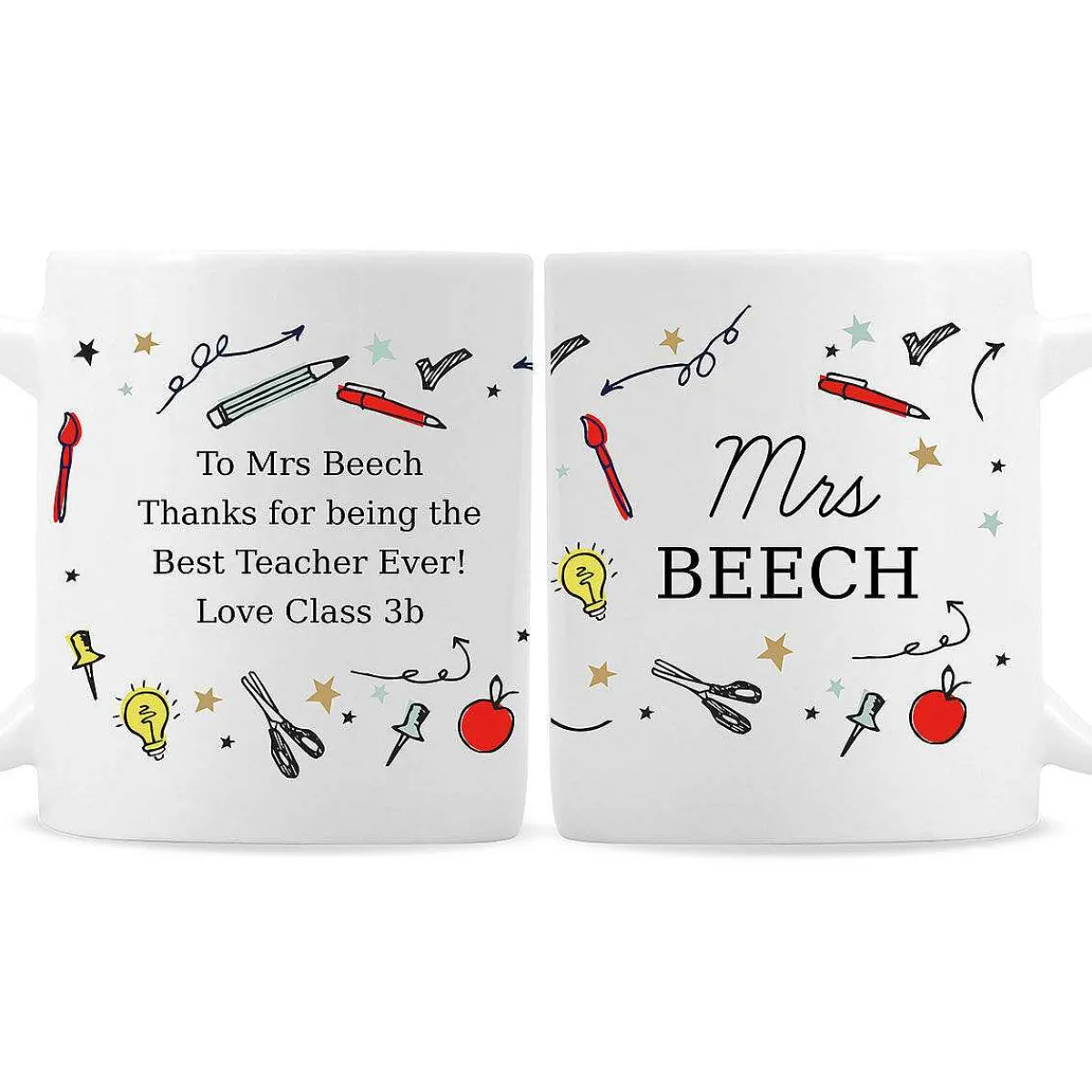Featuring Colourful Illustrations Of Stars, Pencils, And Other Stationery Items. Personalise This Mug With Two Lines Of Text And Four Lines Of Text On The Reverse.