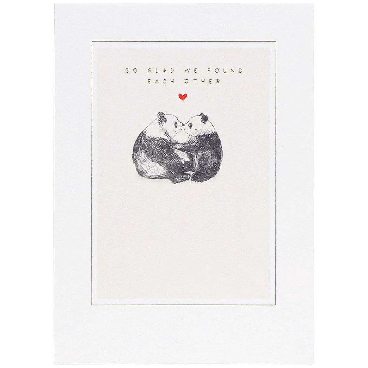 Designed On A Cream Card, It Depicts Two Pandas Gazing Lovingly At Each Other. Above Them There Is A Small Red Heart And Gold Text Which Reads āSo Glad We Found Each Otherā. Surrounding The Image Is A Smart Golden Border Which Frames The Image Beautifully.