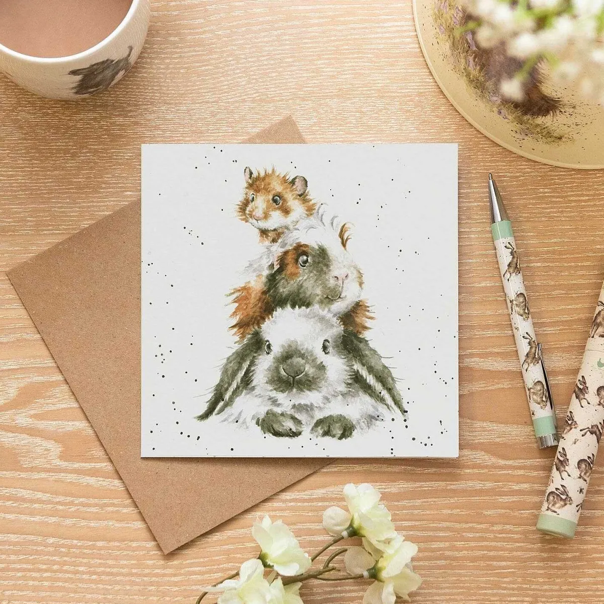 On The Front Of This Card Are Three Lovable Small Pets Cuddling Up On Top Of Each Other. A Grey And White Bunny Rabbit With Floppy Ears Rests On The Bottom Whilst A Guinea Pig Sits ‘Piggy In The Middle’ On Its Back. Perched On The Very Top Is A Cute Little Mouse, With His Scruffy Brown Fur. These Stacked Pets Are Captured Using A Pallet Of Browns And Greys And Are Depicted With Intricate Detail. Around The Trio Are Speckles Of Black Paint, In A Way That It Very Synonymous With The Wrendale Brand.