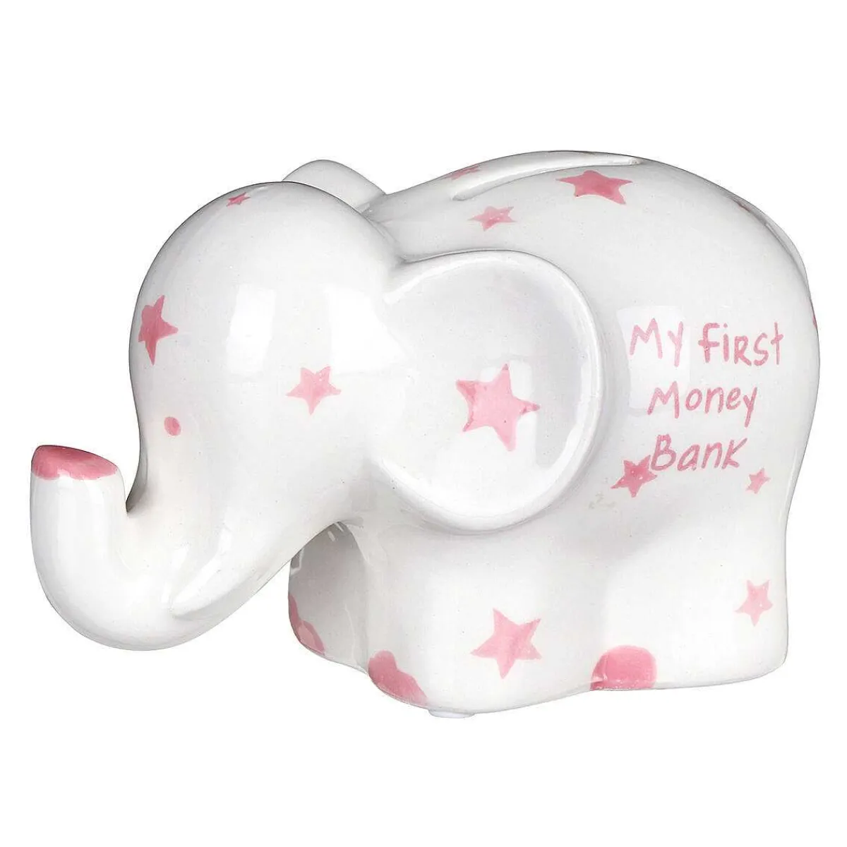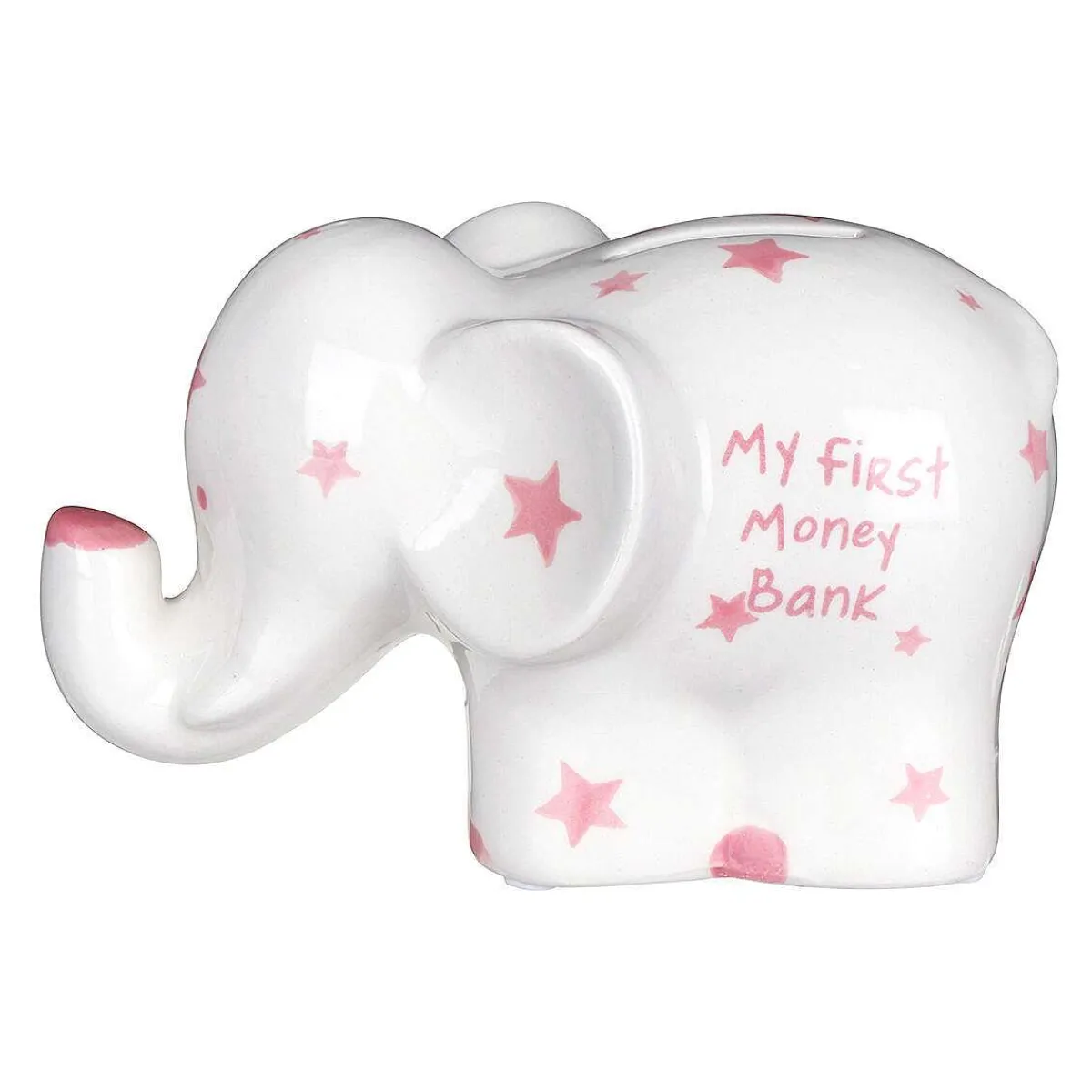 Designed In The Shape Of An Elephant With Long Trunk And Big Ears, The Ceramic Money Box Is White Decorated With A Variety Of Pink Stars. Across The Side Of Its Body Are The Words ‘My First Money Bank’ In Matching Blue Text. On The Back Of The Elephant Is A Slot For You To Place Coins And Notes In To Start Saving. There Is A Removable Rubber Stopper On The Base Which Allows Children To Get To Their Savings!