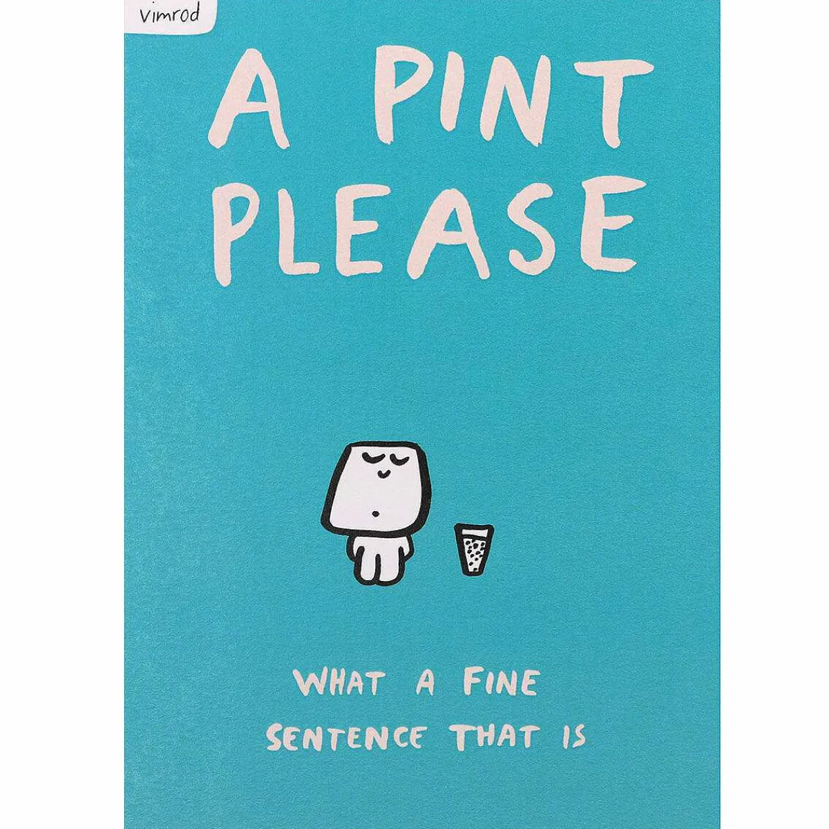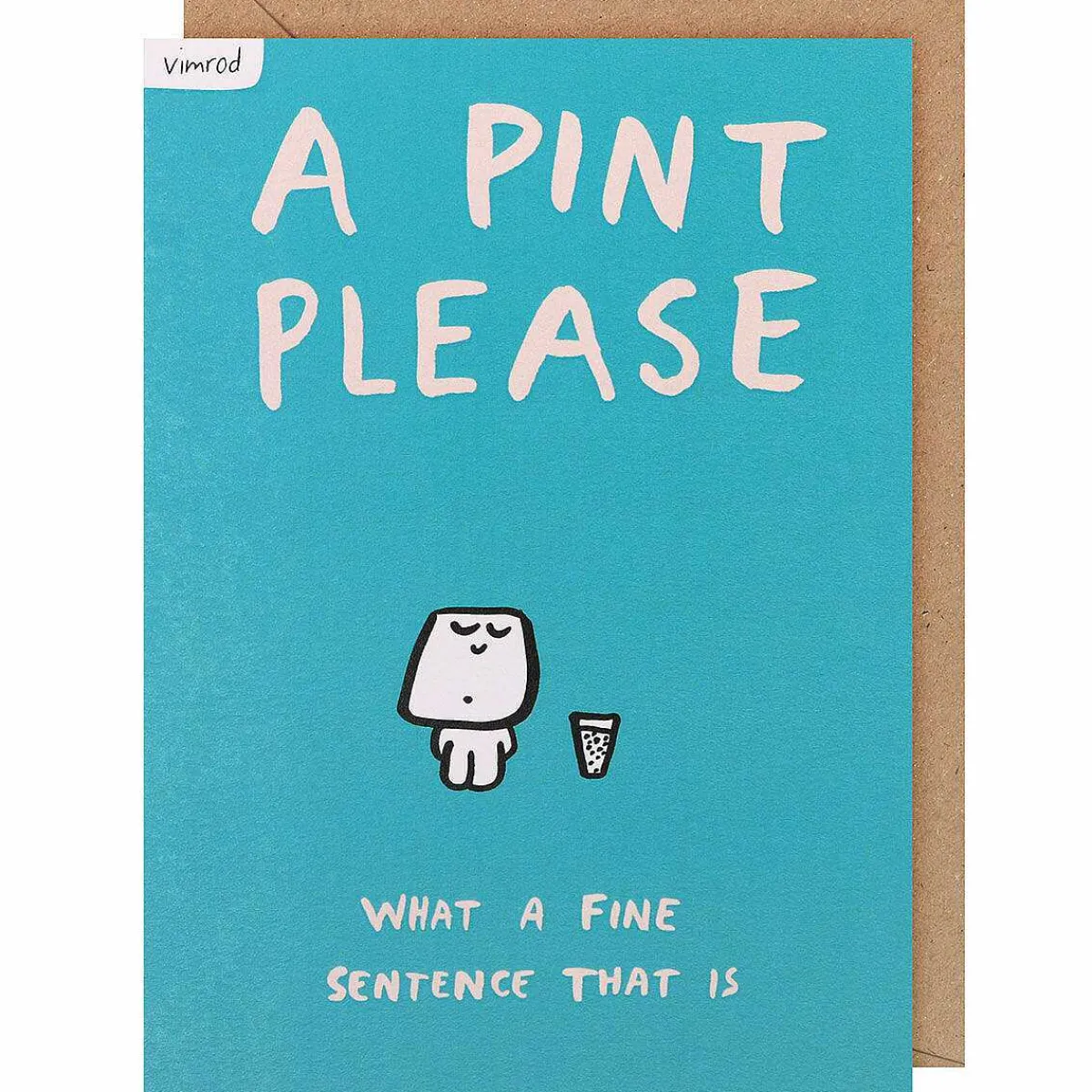 Part Of The Vimrod Collection By Lemon Cards, This Fun Card Is Guaranteed To Make You Chuckle! It Depicts The Hilarious ‘Vimrod’ Character Standing Next To A Beer Glass, Sketched On A Teal Background. The Front Of The Card Reads: ‘A Pint Please. What A Fine Sentance That Is’.