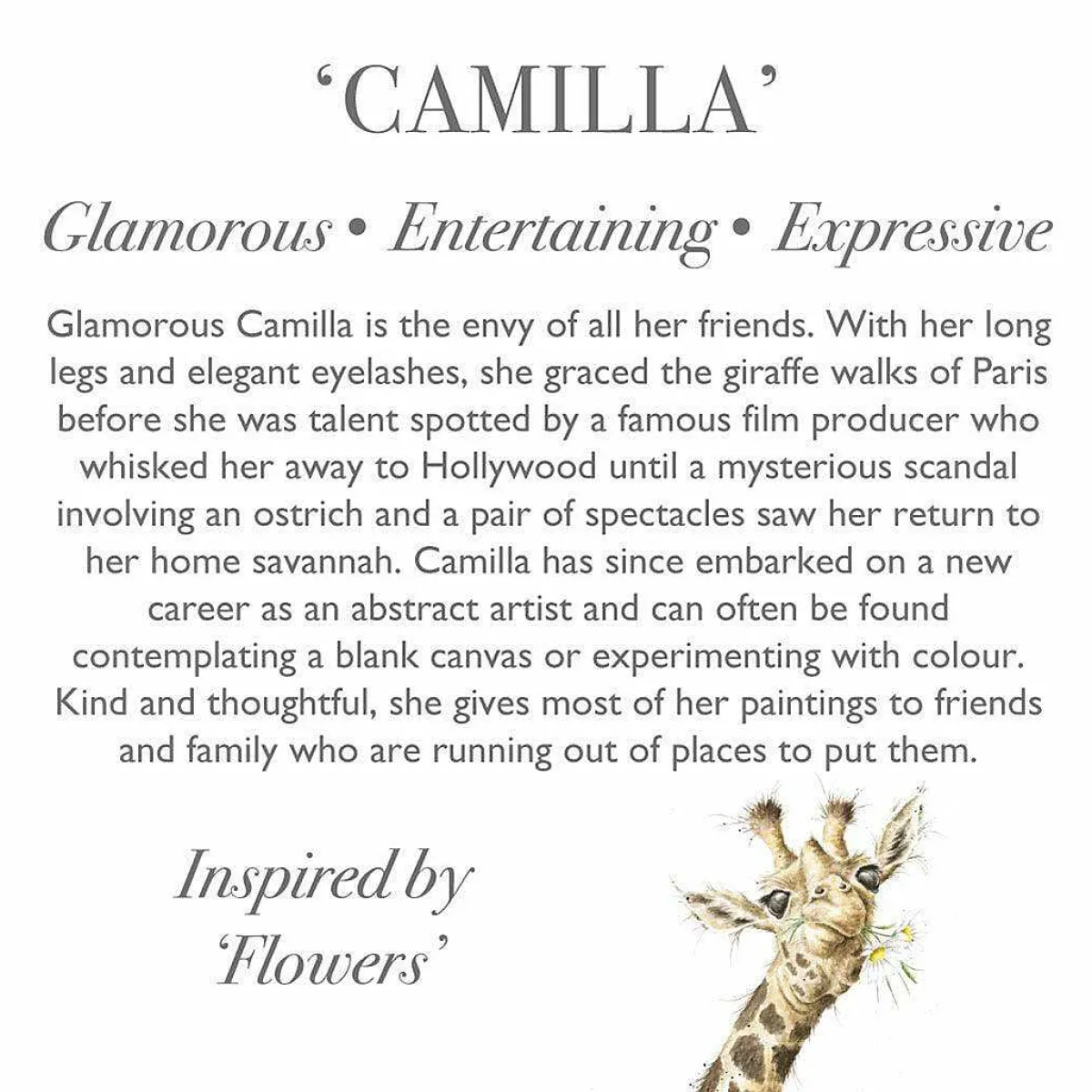 Glamorous Camilla Is The Envy Of All Her Friends. With Her Long Legs And Elegant Eyelashes, She Graced The Giraffewalks Of Paris Before She Was Talent Spotted By A Famous Film Producer Who Whisked Her Away To Hollywood Until A Mysterious Scandal Involving An Ostrich And A Pair Of Spectacles Saw Her Return To Her Home Savannah.