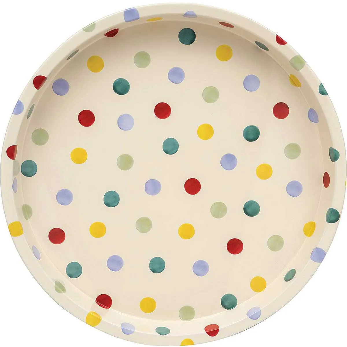 Made From Metal, It Is Round In Shape With Deep Sides Ensuring That Whatever You Are Serving Stays Put! The Wonderful Design Features The Fun And Playful Multi-Coloured Polka Dots In Red, Yellow, Green And Blue. The Design Is Set Against A Cream Background Allowing The Eye-Catching Design To Stand Out.