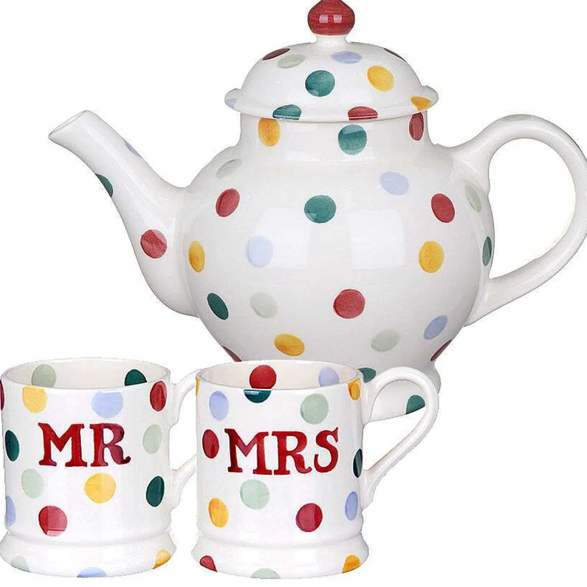 This Wonderful Teapot And Mr & Mrs Mugs Set From The Polka Dot Range By Emma Bridgewater Is Perfect For Any Couple For Tea At Any Time Of Day! The Set Includes One Four-Pint Teapot And A Set Of Two Mugs; One Featuring ‘Mr’ Across The Front And The Other Featuring ‘Mrs’. Perfect For A Morning Brew Or Afternoon Tea, This Set Makes A Wonderful Gift For Any Couple, Ideal For A Wedding, Anniversary Or Any Special Occasion.