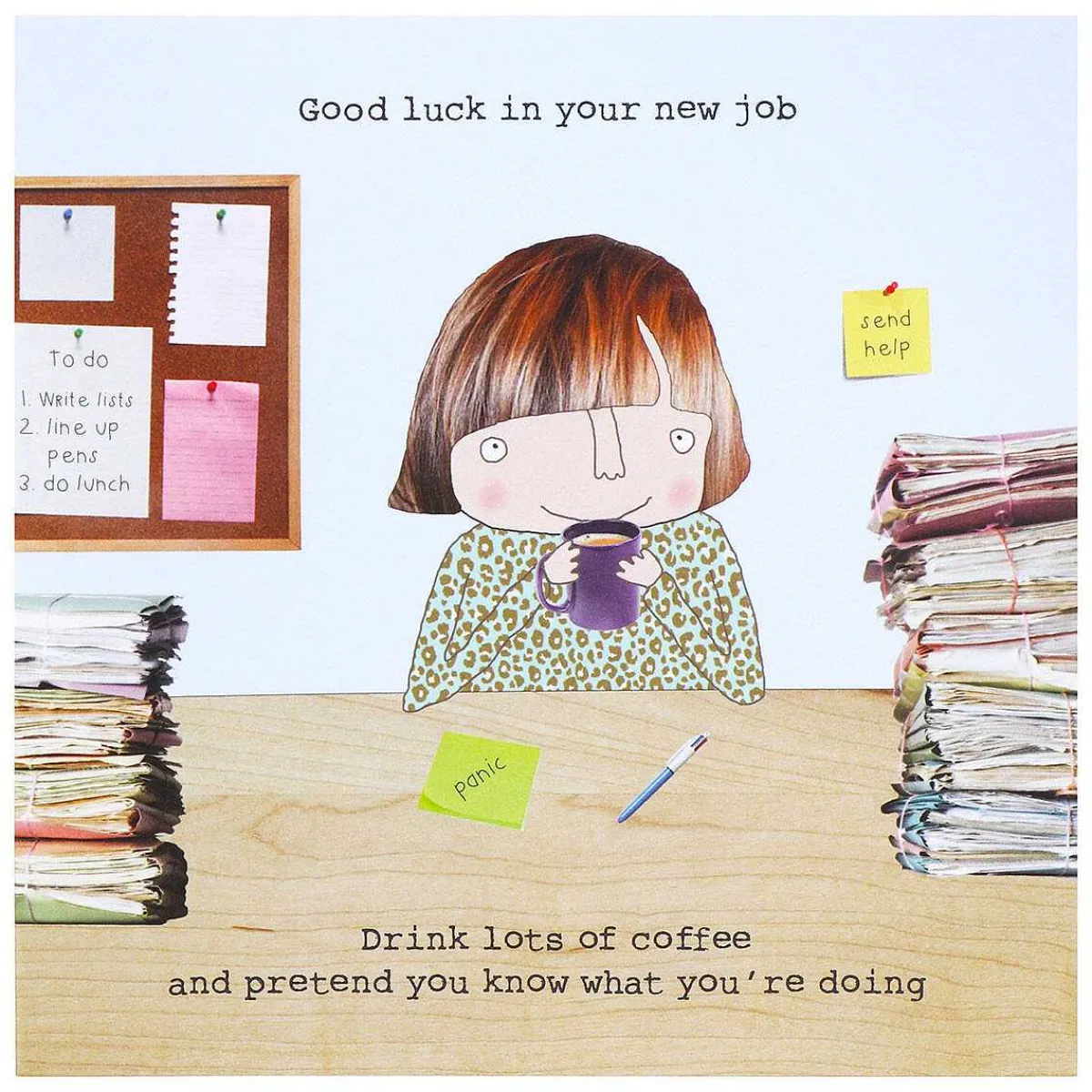 Designed Against A Pale Blue Background, This Card Features A Woman Sitting At Her Desk, Looking Slightly Confused Whilst She Sips Her Mug Of Coffee. Surrounding Her Is A Stack Of Paperwork, Along With Handwritten Sticky Notes With Messages That Read ‘Panic’ And ‘Send Help’. The Text, Which Is Printed In A Black Typewriter Font, Reads;