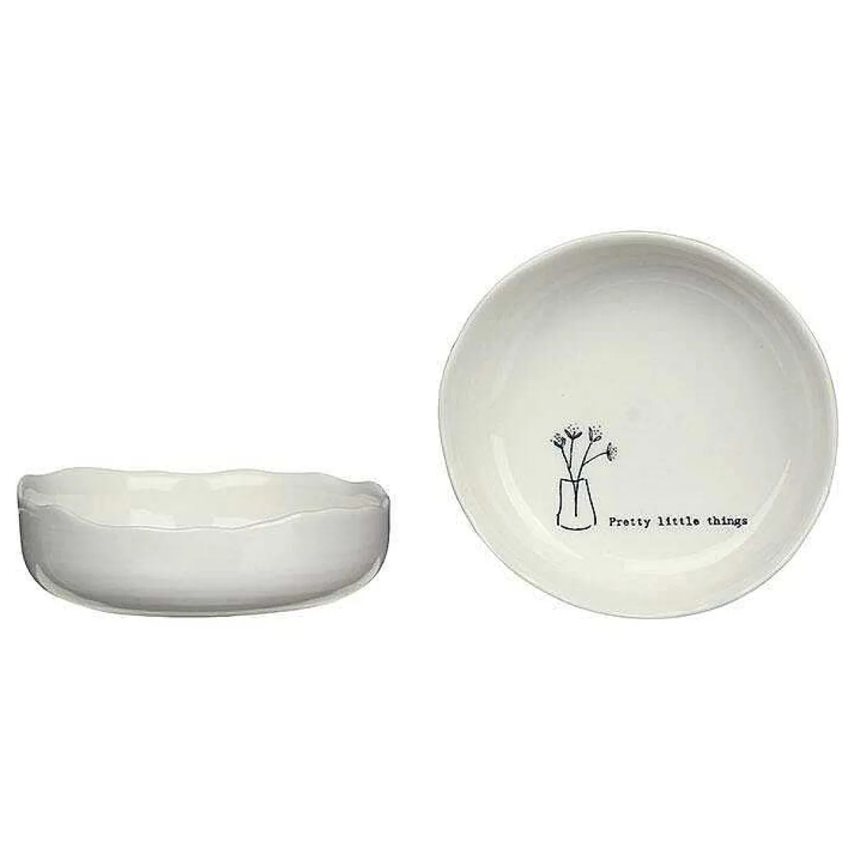 The Inside Of The Dish Features The Words ‘Pretty Little Things’ Along With A Dainty Illustration Of Some Flowers In A Vase.
