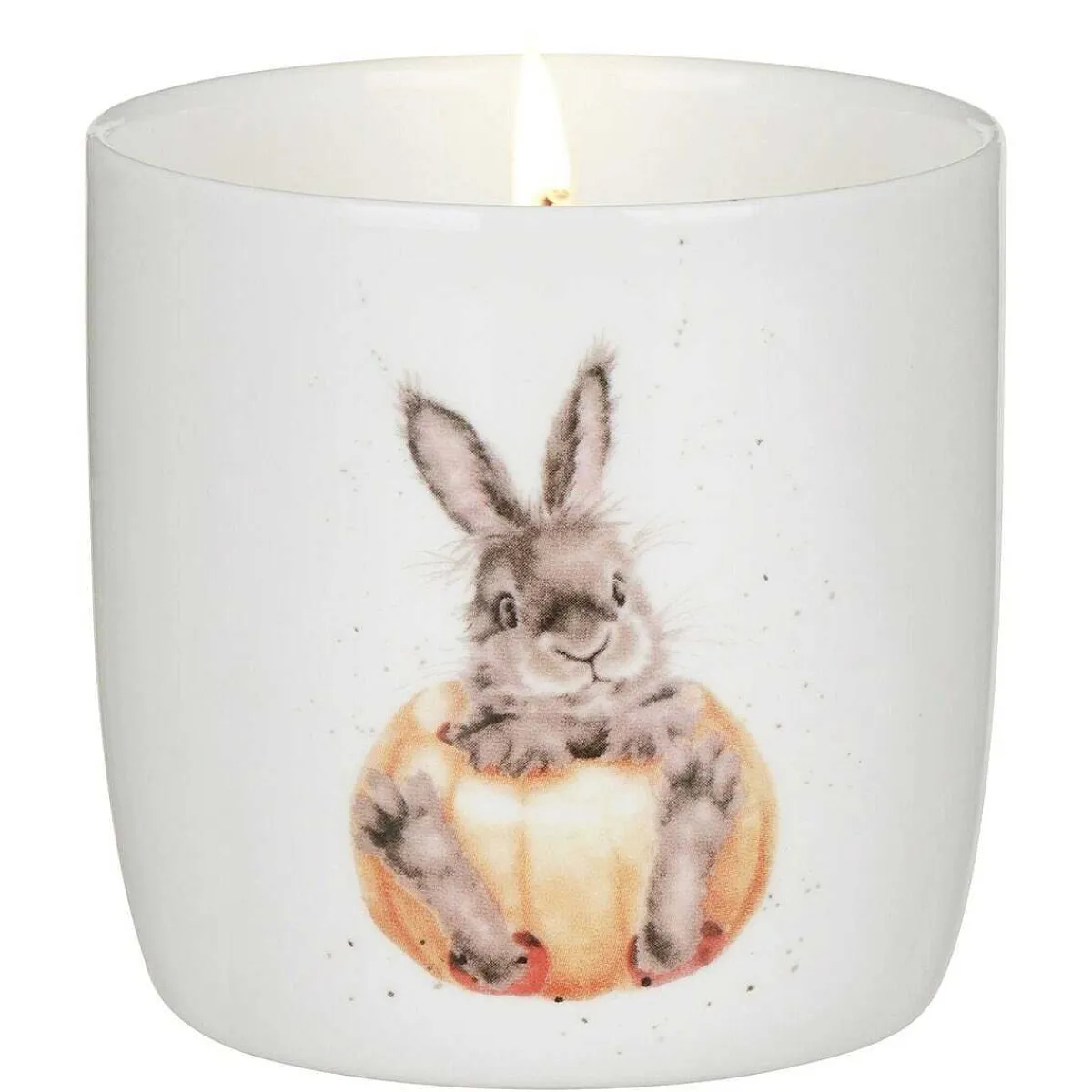 Made Of Ceramic, This Candle Depicts An Adorable Bunny Painted In Soft Watercolour Tones, In The Signature Style Of Wrendale Designer, Hannah Dale. The Illustration Depicts An Endearing Bunny Who Has Managed To Hollow Out A Pumpkin So He Can Sit In It, Ready For Halloween. This Is All Set Against The Crisp Cream Background. Around The Bunny Are Interspersed Speckles Of Black Paint, In A Way That Is Very Synonymous With The Wrendale Brand.