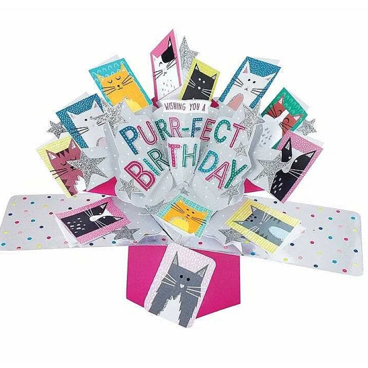 This Innovative Card Is Elasticated And Therefore Springs To Life When Removed From Its Envelope. In The Centre Of The Card, A Large Banner Reads ‘Wishing You A Purr-Fect Birthday’ And Is Surrounded By Shimmering, Silver Glitter Stars And Pictures Of Cats. The Whole Design Jumps Out Of A Pink Box, With Its Sides Splaying And A Tag Hanging From The Middle Which Is Left Blank Inside For You To Personalise.