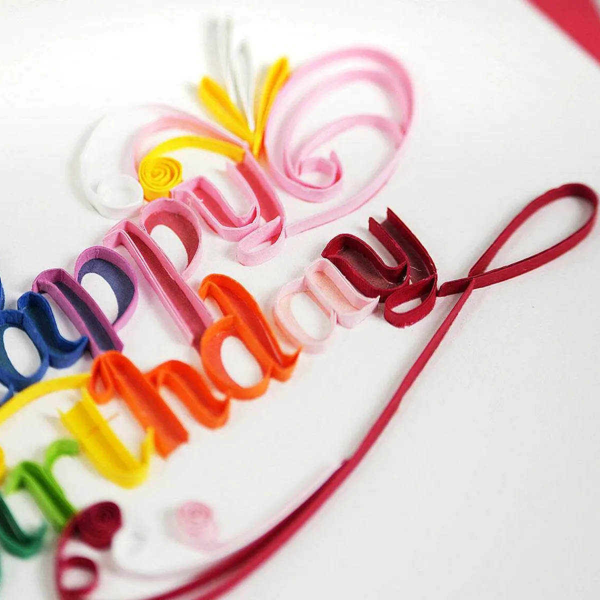 An Incredible Feat Of Paper Engineering, This Gorgeous 3D Card Looks Fabulous From Every Angle. It Features Layers Of Quilled Card That Has Been Meticulously Rolled By Hand To Create Intricately Patterned 3D Text That Reads “Happy Birthday” In A Rainbow Script Font, On A Textured White Background.