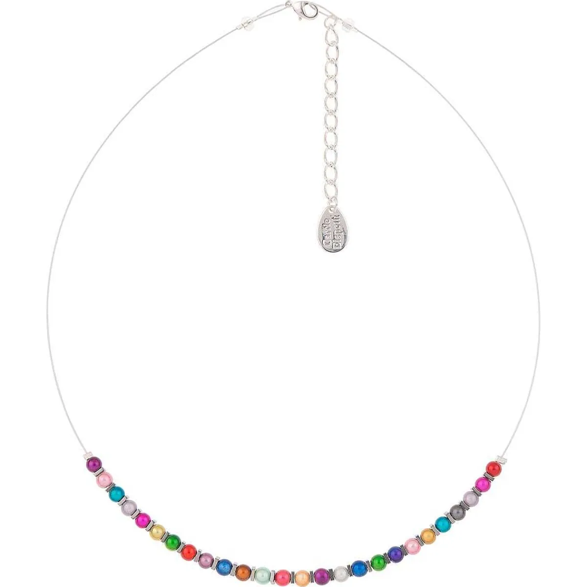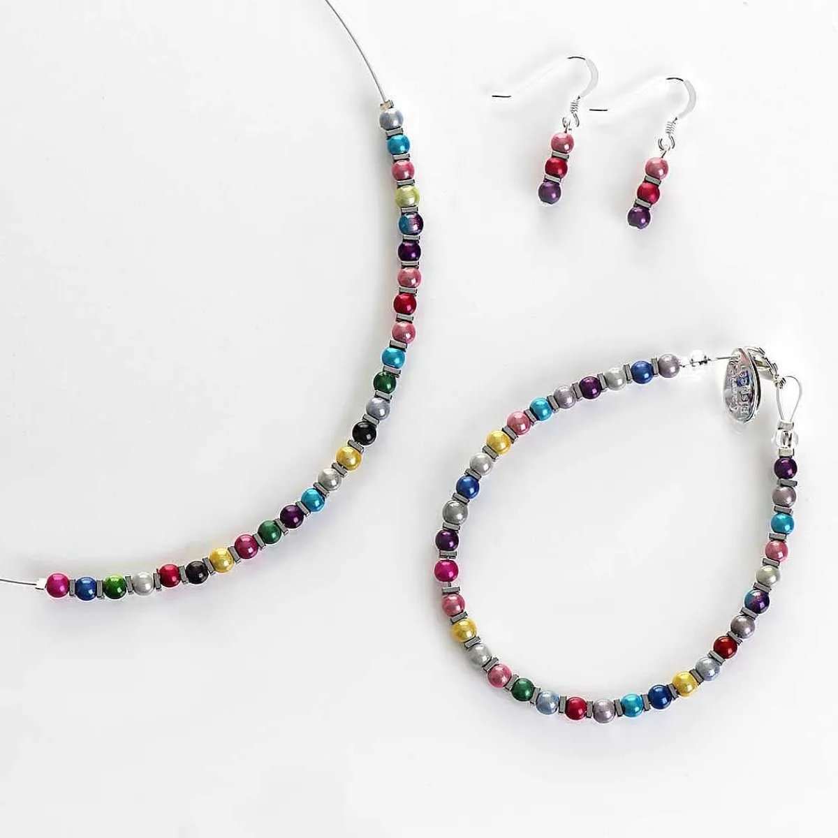 The Beautiful Necklace Is Made Up Of Multi-Coloured Miracle Beads Which Are Strung Together To Form A Rainbow. Each Small Round Bead Has A Shiny Finish And Is Separated By A Silver Square Haematite Bead Which Sit Around The Front Of The Necklace, Creating A Sophisticate Charm. The Beads Are Strung On A Fine Silver Wire That Fastens With A Spring Clasp Complete With An Extender Chain. Combine This With The Matching Bracelet And Earrings To Complete Your Look.