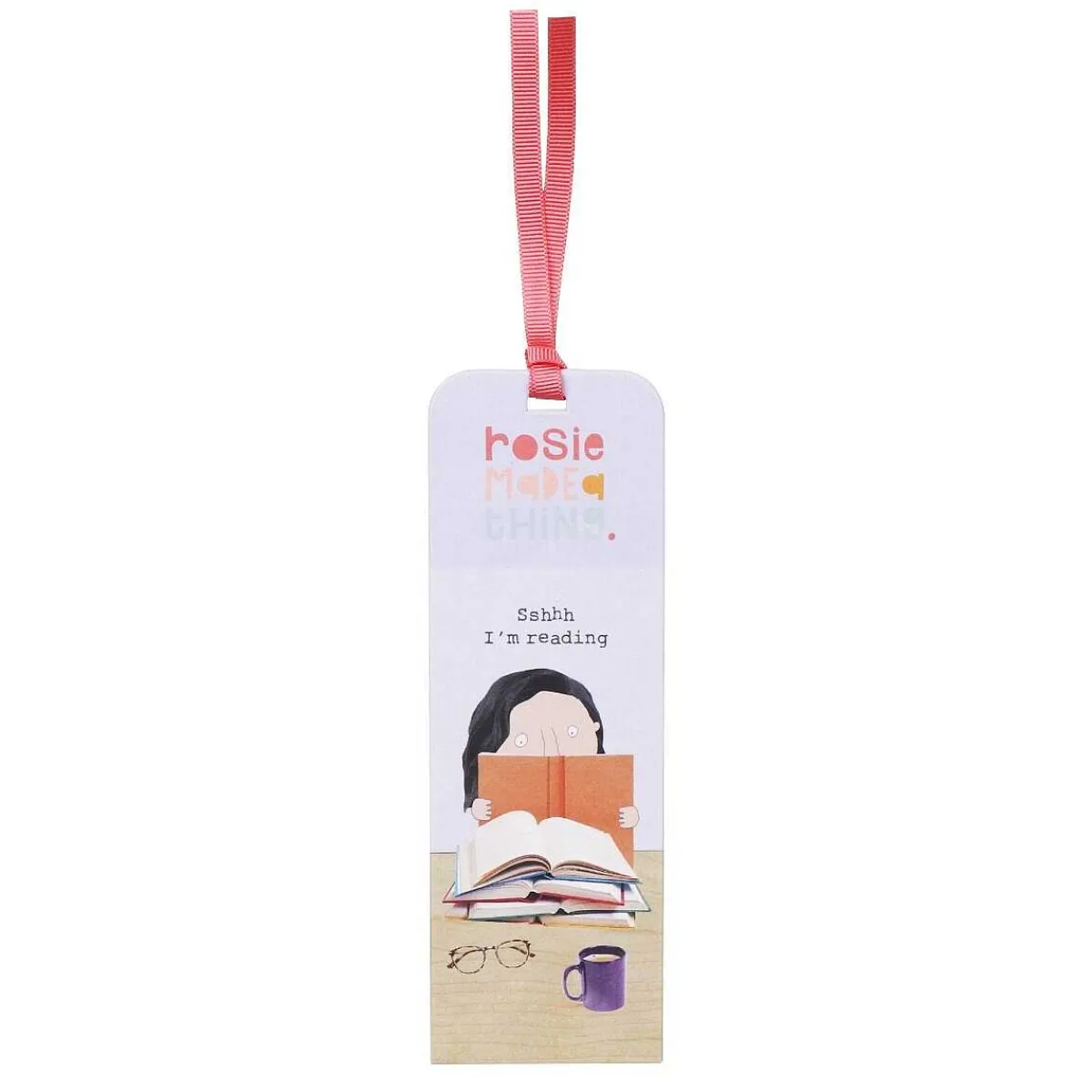This Extra Thick Card Bookmark Will Help You Keep Your Page When Reading Your Favourite Book. The Bookmark Features A Fun Illustration Of A Lady With Her Nose In A Book, There Are Several Books Open In Front Of Her, Accompanied By Glasses And A Mug Of Tea. The Design Is Set Against A Lilac Background, With A Phrase Written A Typewriter Font Which Reads; ‘Sshhh I’M Reading’. Across The Top Of The Bookmark Is The Rosie Made A Thing Logo On A Pale Purple Background, Complete With A Pink Ribbon Attached At The Top.