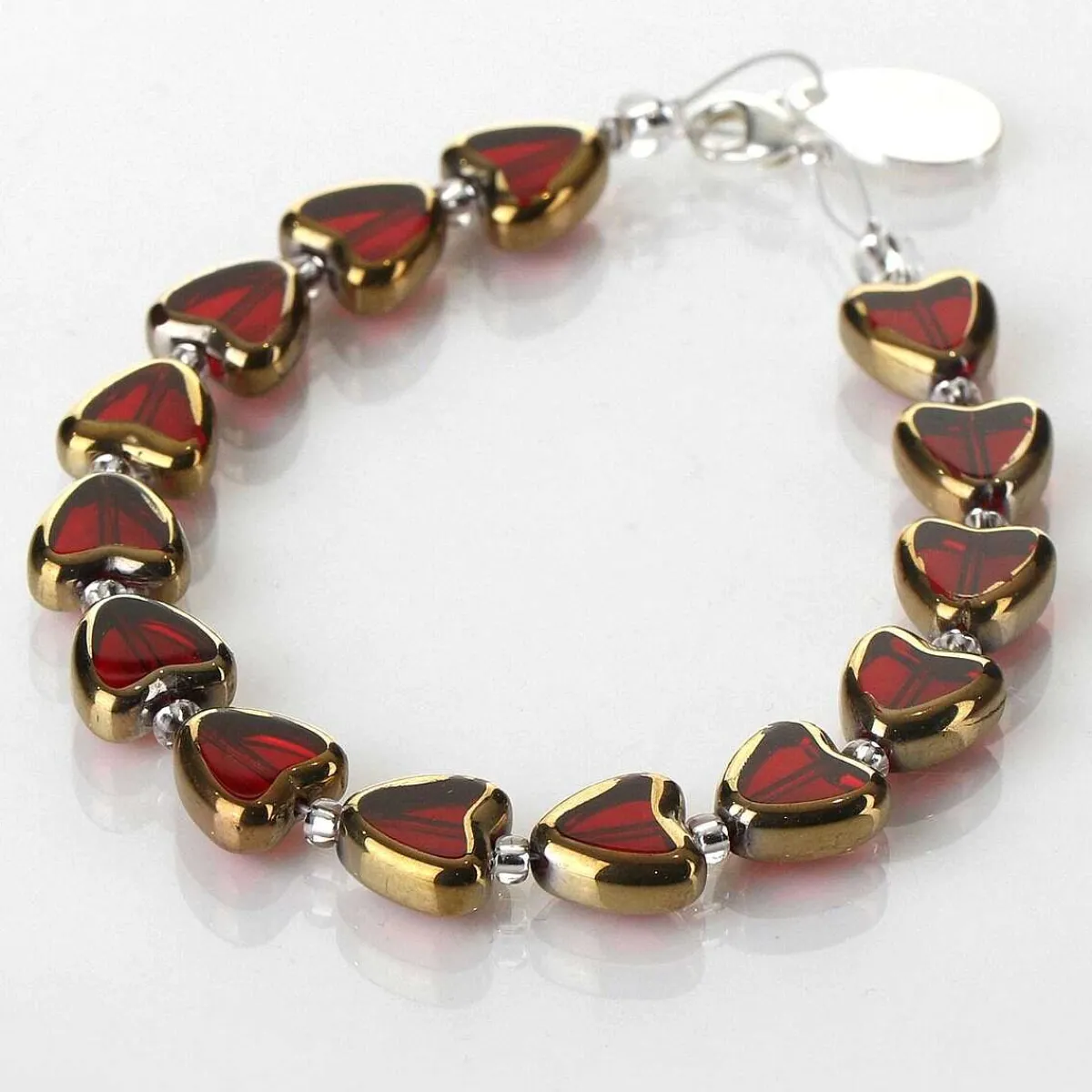 Add A Heartfelt Touch To Any Outfit With This Beautiful Bracelet From Carrie Elspeth! This Bracelet Features Beautiful Translucent Red Heart-Shaped Glass Beads With An Electroplated Golden Edge, Alternated With Petit Spacer Beads That Cover The Entirety Of The Silver Wire. Perfect For Any Formal Or Casual Event, This Magnificent Bracelet Will Add An Elegant Touch To Any Outfit And Can Be Combined With The Matching Necklace And Earrings To Make The Perfect Gift.
