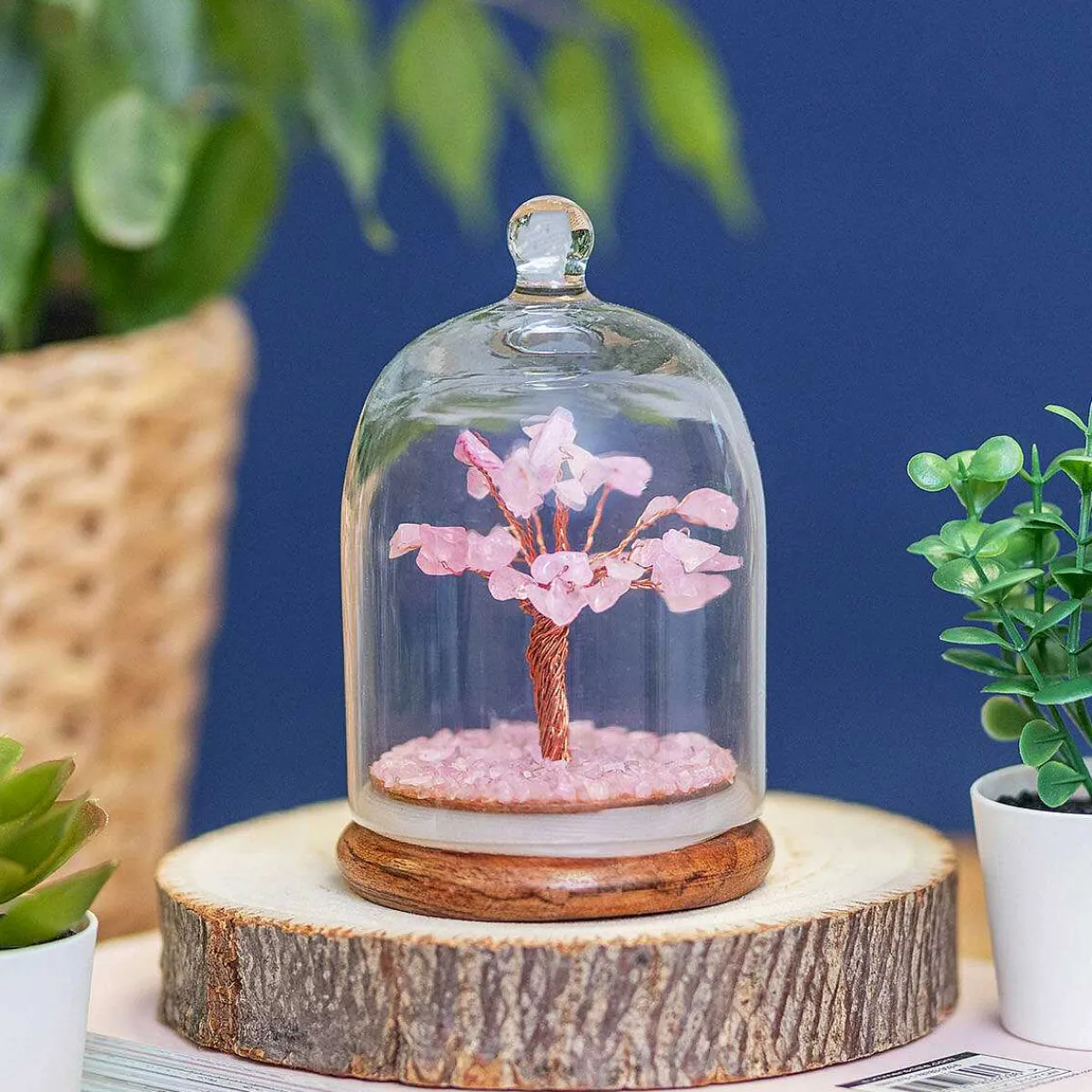 Made From Rose Quartz Crystals, This Tree-Shaped Ornament Is The Perfect Good Luck Charm. The Tree Is Presented Beautifully Within A Glass Dome Which Will Look Beautiful Displayed In Your Home And Creates A Tranquil Atmosphere In Your Living Space.