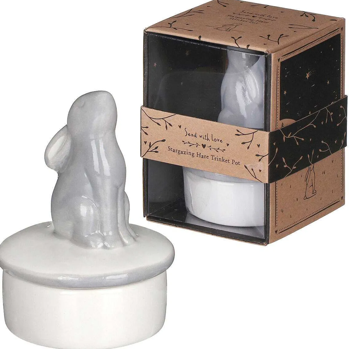 Presented In A Brown Card Box With A Countryside Scene On The Sides. There Is Text Which Reads ‘Send With Love’ ‘Stargazing Hare Trinket Pot’. This Gorgeous Trinket Pot Is Simple Yet Stylish And Would Make A Wonderful Gift For Birthdays And Christmas, Perfect For Any Countryside Lover.