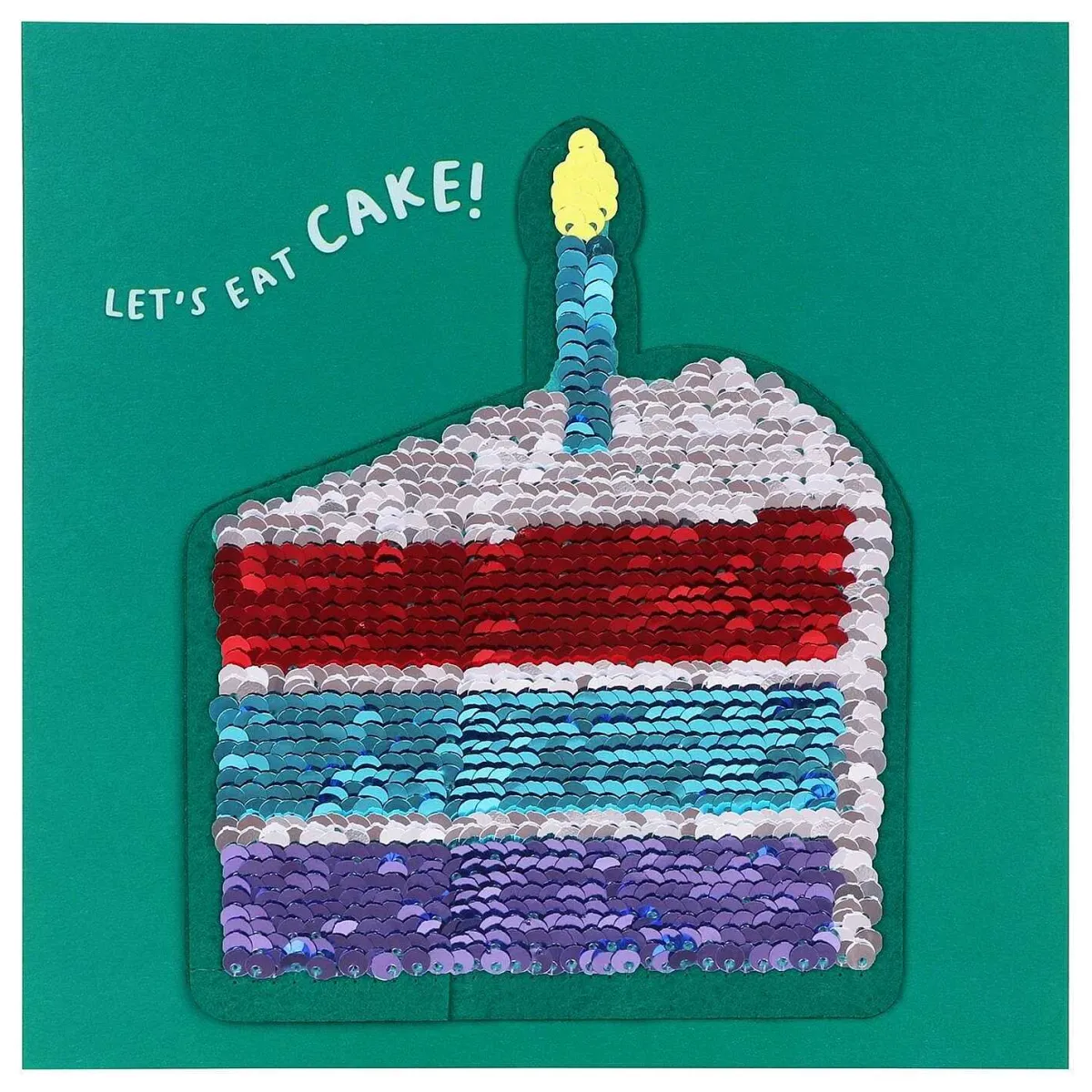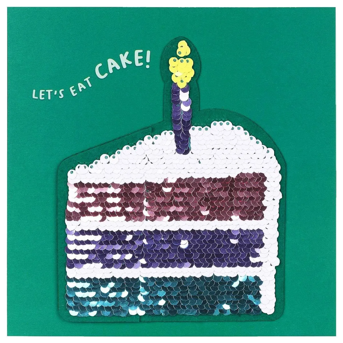 This Sequined Card From The Shine Range By Redback Is Perfect For Anyone Who Loves Cake. It Also Features A Peel-Off Patch Slice Of Cake With Reservable Sequins Which The Recipient Can Use To Add Some Sparkly Charm To Anything They Fancy Such As Stationery, Clothes, Or Bags Once The Occasion Is Over!