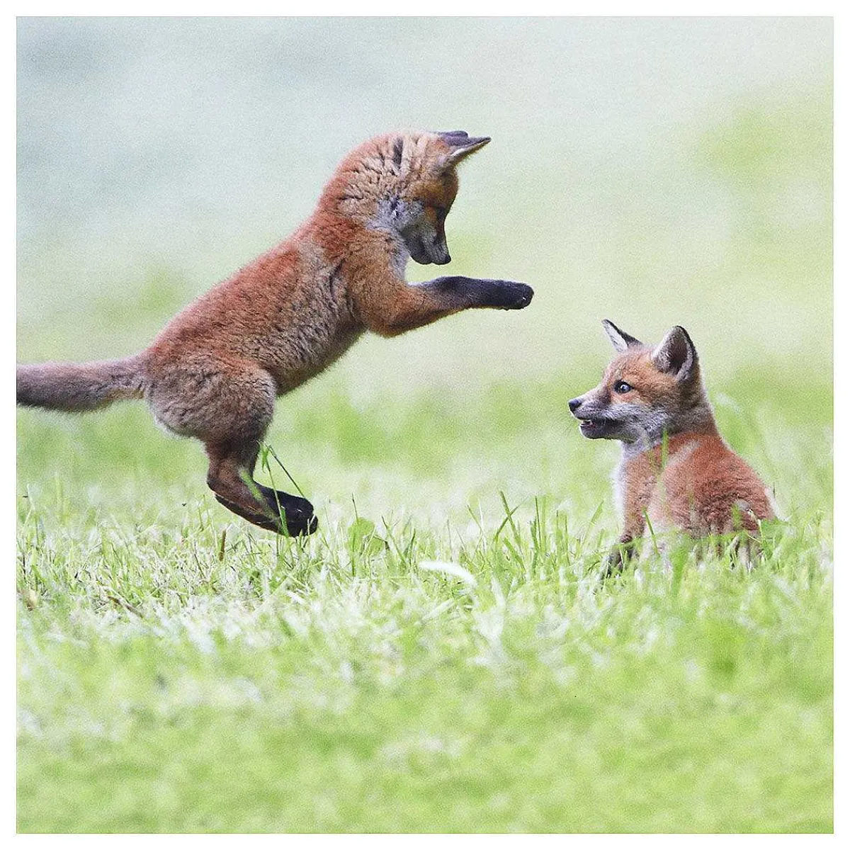 Inspired By The Bbc Programme Springwatch; This Stunning Greeting Card Features A Photograph Of Two Playful Fox Cubs. In A Green Grassy Field One Fox Cub Is Mid Pounce About To Surprise Its Sibling.