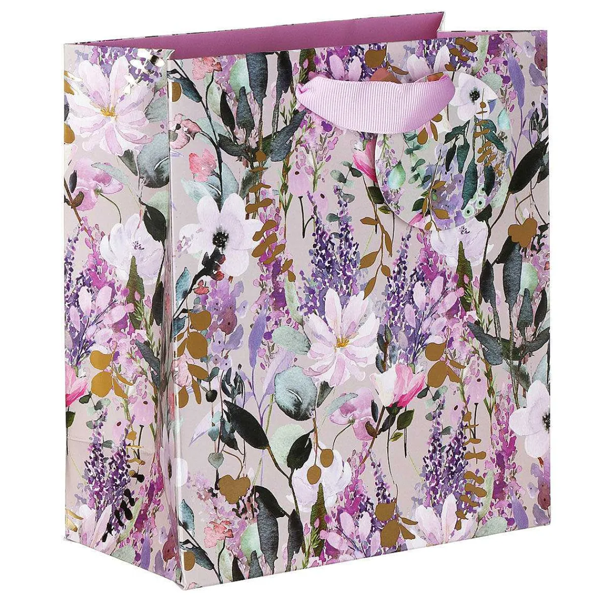 Give A Gift In A Stylish Gift Bag From Glick! This Stunning Gift Bag Is Adorned With Watercolour Lilac Blooms, Sprigs Of Flowers And Purple Buddleia Interspersed With Green Foliage And Gold Highlights. The Floral Pattern Is Set Upon A Grey Background Creating A Sophisticated Look.