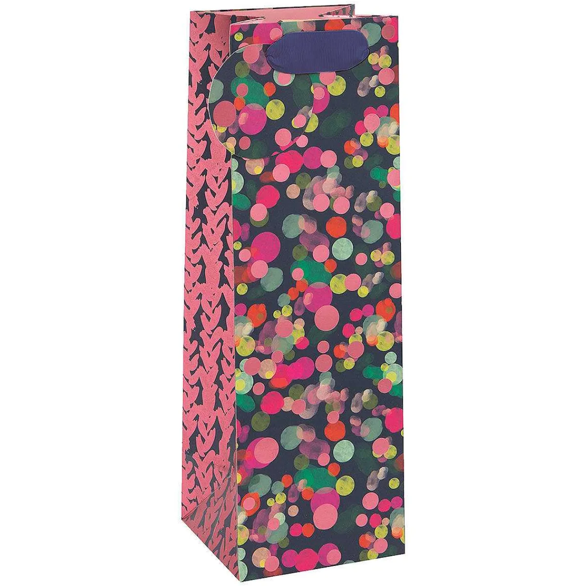 Give A Gift In This Stylish Gift Bag From Glick! This Bottle Gift Bag Is Vibrant And Beautiful, Perfect For Birthdays, Mother’S Day Or Any Celebratory Occasion. The Design By Stephanie Dyment Features A Pink, Orange, Green And Shimmering Rose Gold Polka Dot Design On A Deep Navy Background. This Gift Bag Features Navy Wide Ribbon Handles And Comes With A Matching Circle Gift Tag For You To Personalise Your Own Message.