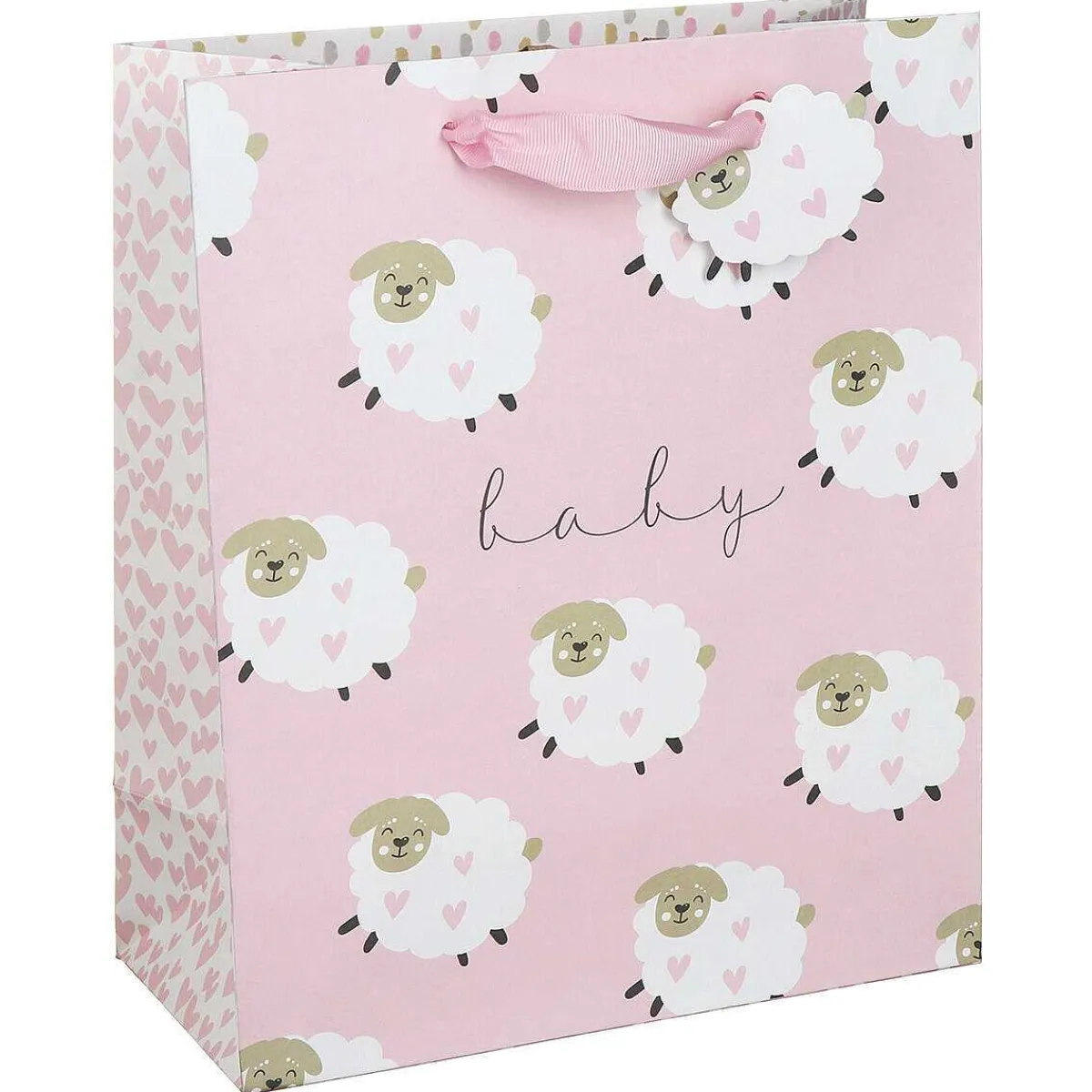 This Large Gift Bag Is Adorned With Smiling Fluffy Sheep With Pink Hearts Set On A Pale Pink Background. With Grey Text In The Centre That Reads ‘Baby’. This Large Gift Bag Features Pink Wide Ribbon Handles Which Make It Easy To Carry.