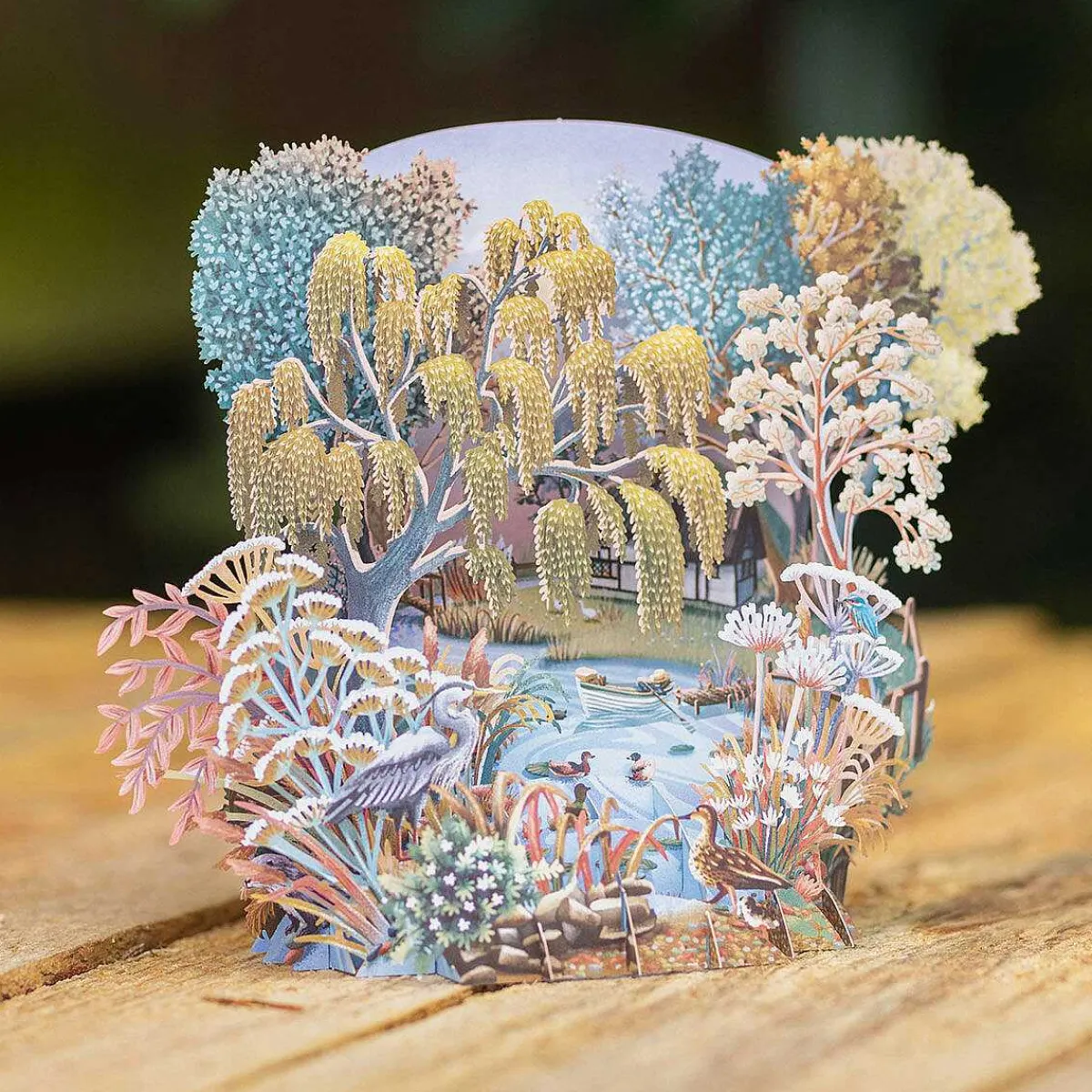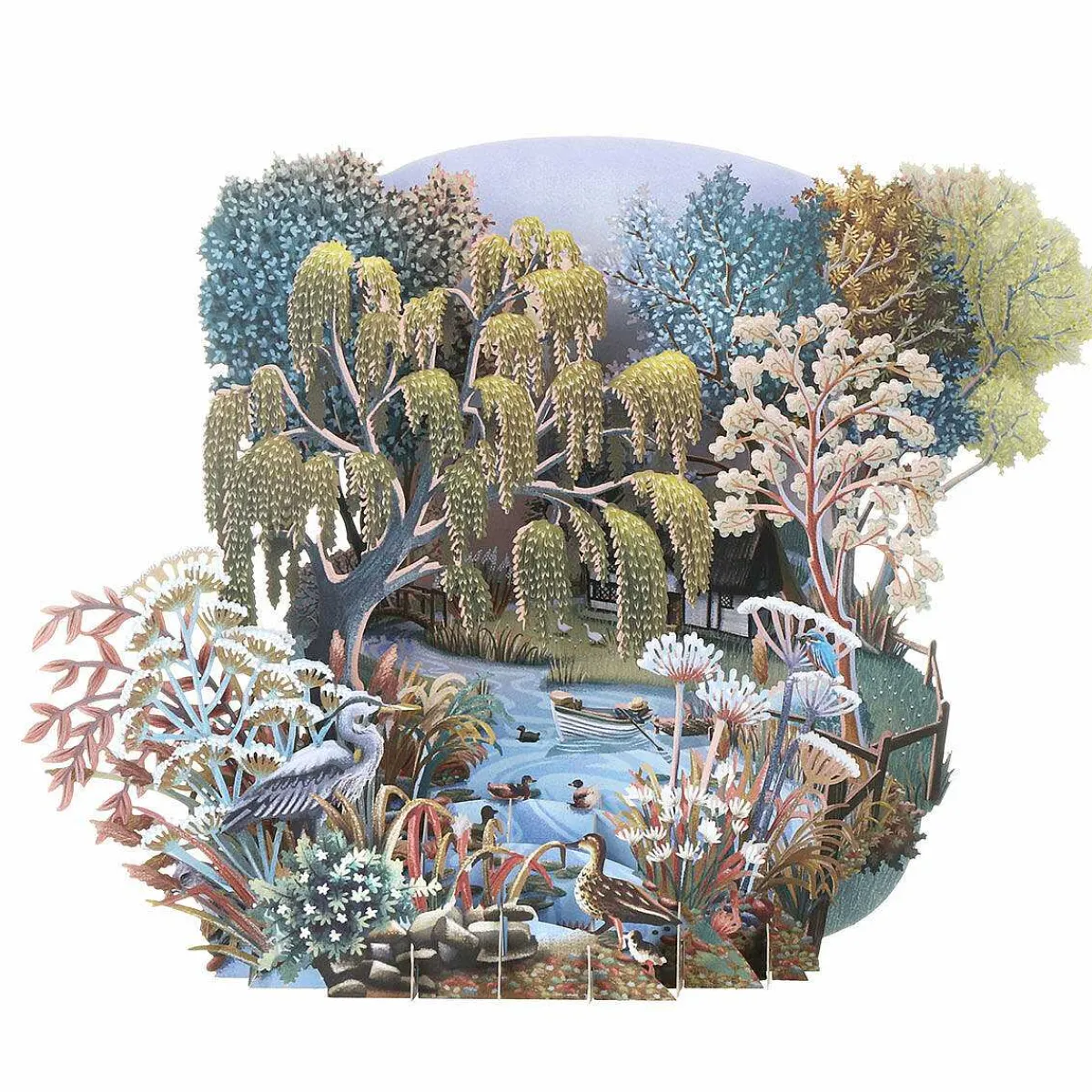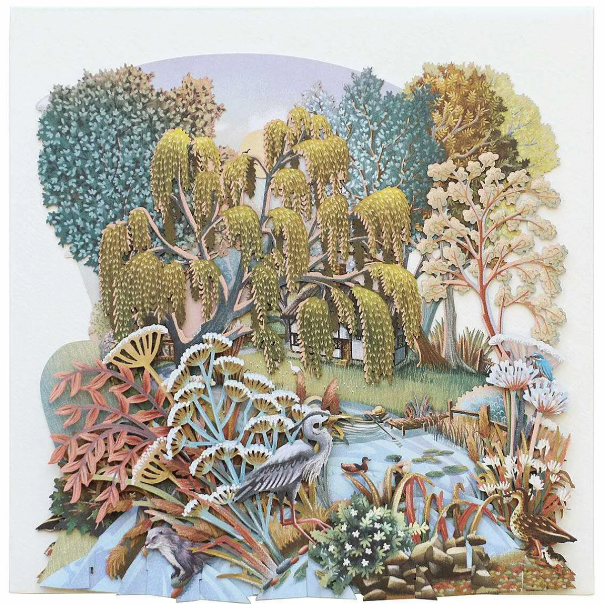 This Popup 3D Card Is Beautifully Designed With Laser Cut, Intricate Details Bringing It To Life. It Depicts A Beautiful Summery Scene With A Variety Of Trees And Birds With A River Flowing Through The Middle With A Small Rowing Boat Surrounded By Lily Pads And Ducks.