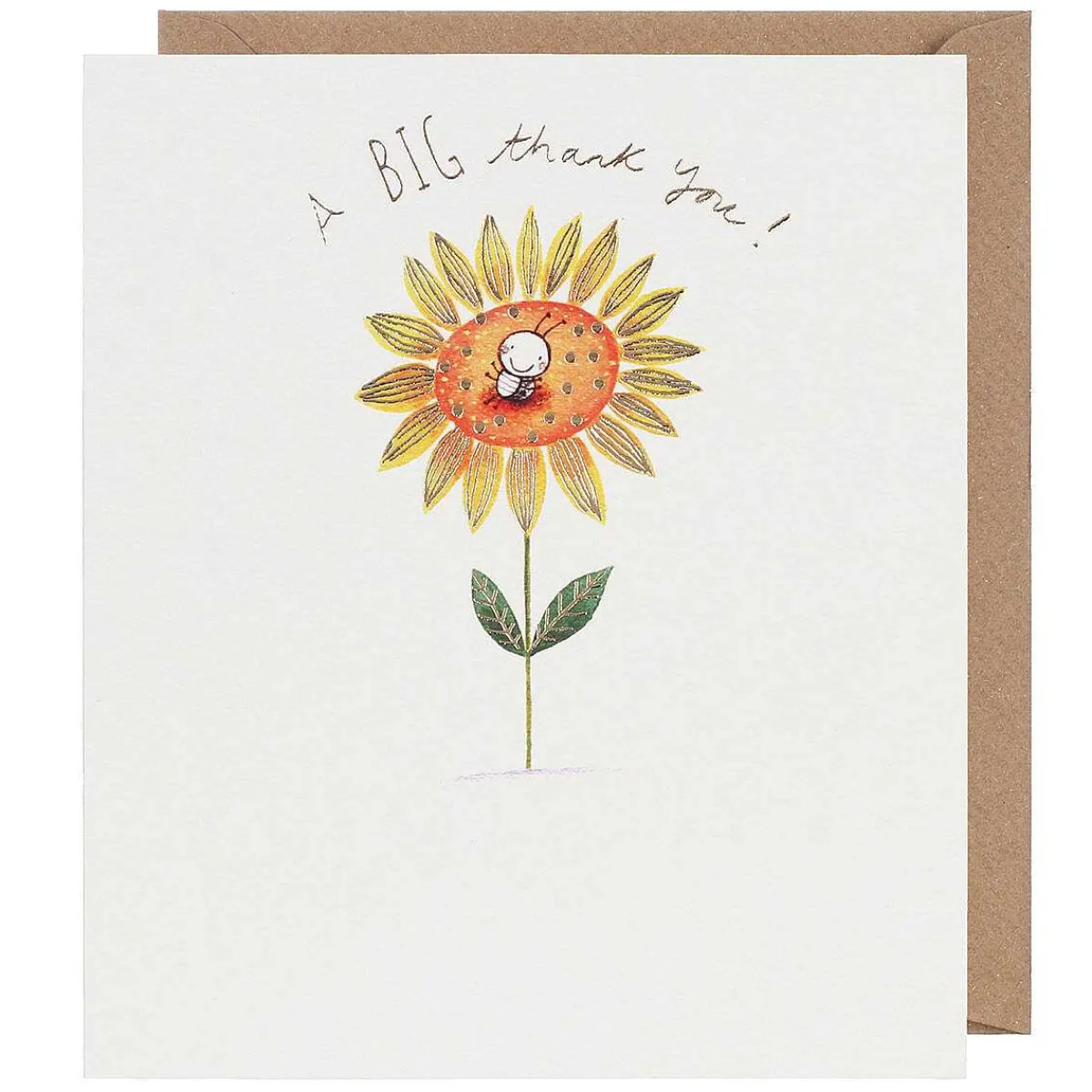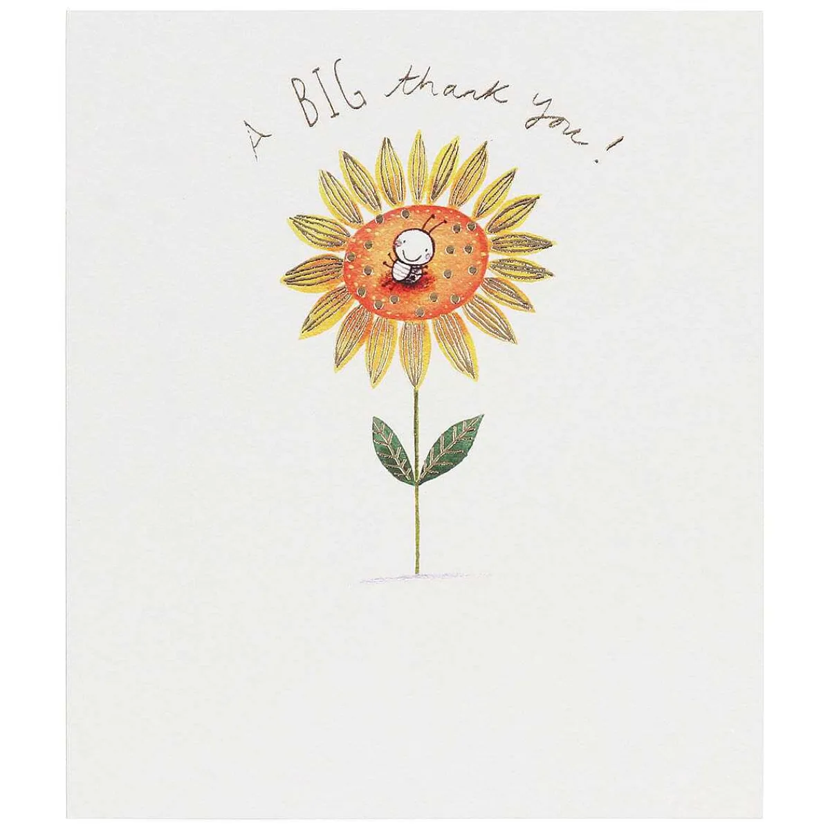 Featuring A Beautiful Illustration Of A Bright Sunflower With Orange Centre And Yellow Petals With Accents Of Shimmering Gold Set On A Cream Background. There Is A Small White Smiling Bug Sat In The Centre Of The Flower. Above The Image Is Gold Text Which Reads ‘A Big Thank You!’
