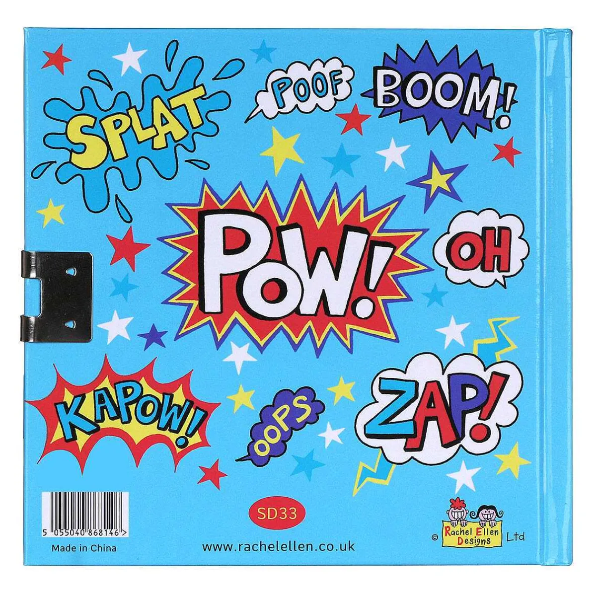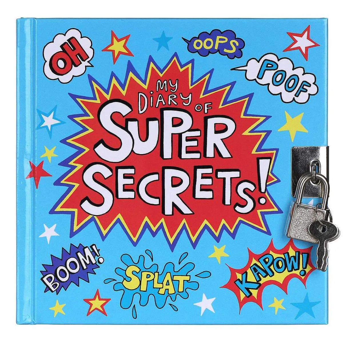 Printed On A Pale Blue Background, There Is Lots Of Cartoon Illustrations With Phrases Such As ‘Kapow’ ‘Splat’ And ‘Poof’. With Large Text In The Centre Which Reads ‘My Diary Of Super Secrets’. The Lined Pages Inside Are White With A Small Cartoon Illustration In The Corner Of Each Page. The Little Padlock Secures The Diary And Comes With Two Keys Just In Case You Lose One!
