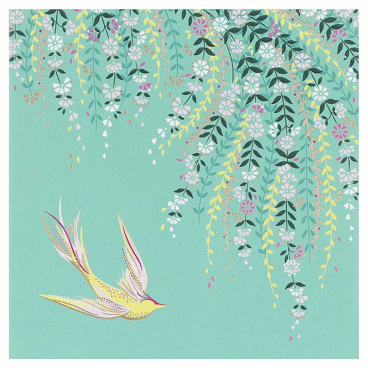 Intricate And Ornate In Its Design, This Gorgeous Gold Foiled Greetings Card From Sara Miller Is Perfecting For Sending On Any Occasion. The Front Of The Card Is Decorated With A Swift Darting Around The Trailing Flora. This Is All Set Against A Beautiful Green Background And Shimmering Gold Foil Is Used Around The Card Which Adds A Luxurious Touch To The Design.