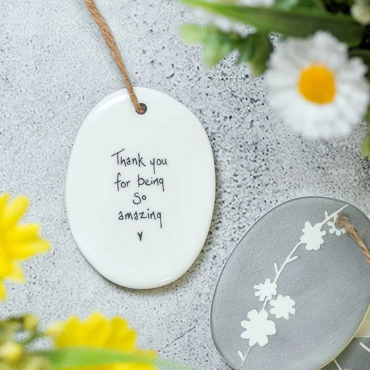 Made From Crisp White Porcelain, The Sign Features The Words ‘Thank You For Being So Amazing’ Inscribed Onto The Surface. The Porcelain Has Been Decorated With Sprigs Of Flowers, Illustrated In A ‘Sgraffito’ Style That Has Been Scratched Into A Textured Grey Surface. A Hole Is Punched At The Top And A Sturdy Piece Of String Is Attached, Allowing This Hanging Ornament To Be Hung On The Wall, Or From A Hook Or On A Cupboard Door, Adding Subtle Detail Wherever You Decide To Display It.