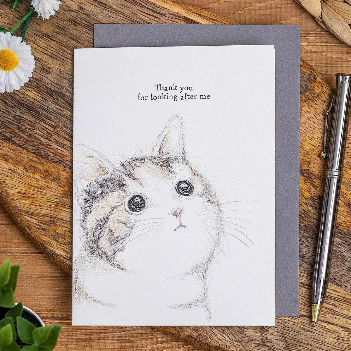 This Tasteful White Coloured Card Displays An Image Of An Endearing Cat With Large Black Eyes. The Card Has Text Above The Image Which Reads ‘Thank You For Looking After Me’ Written In The Traditional East Of India Style Font.