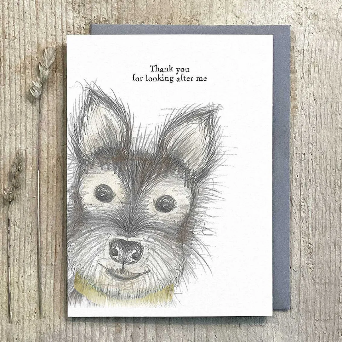 This Tasteful White Coloured Card Displays An Image Of A Large Scruffy Dog. The Card Has Text Above The Image Which Reads ‘Thank You For Looking After Me’ Written In The Traditional East Of India Style Font.