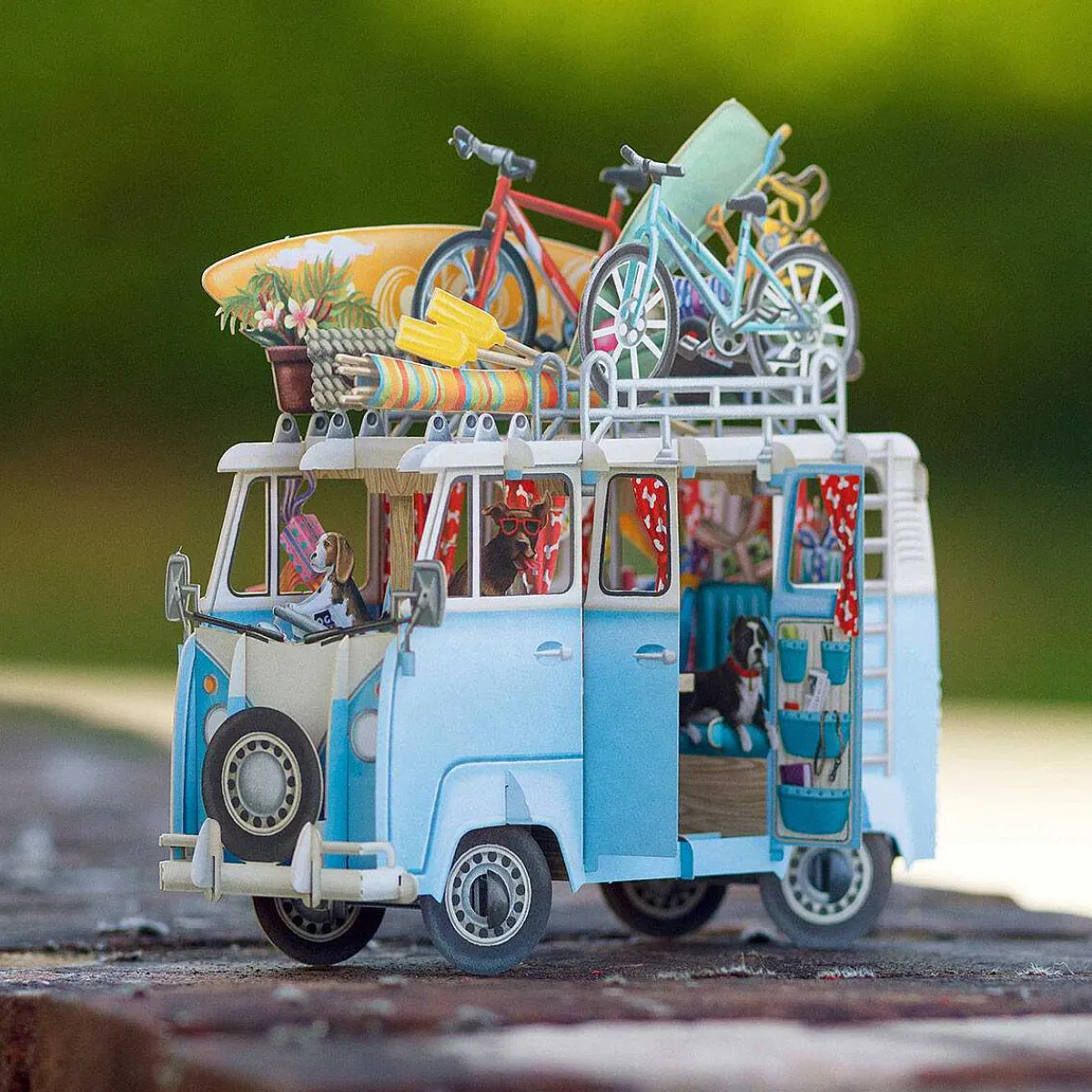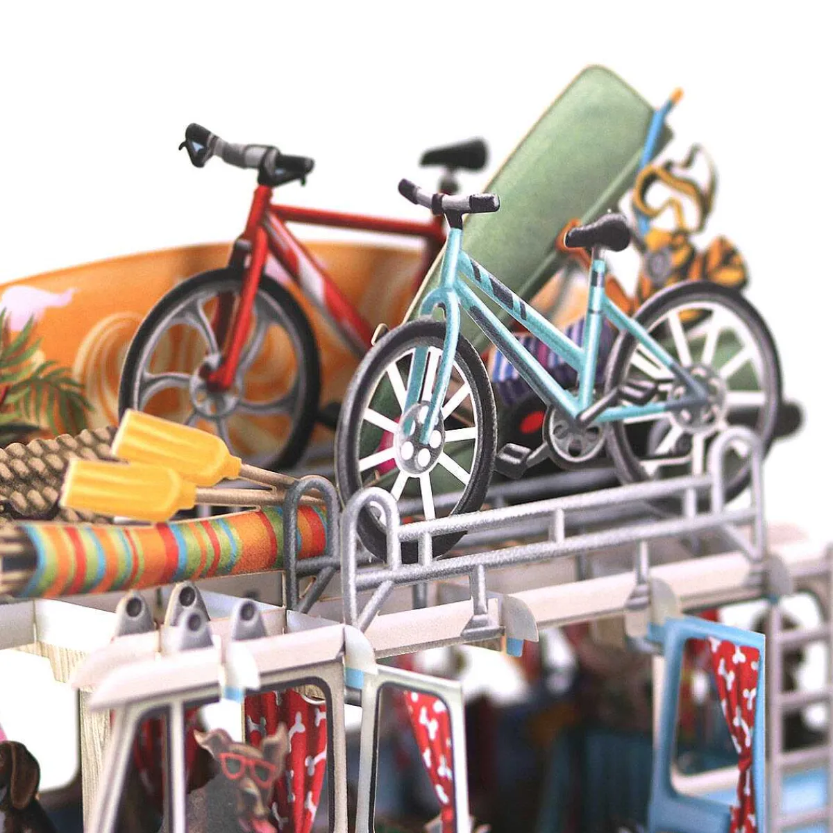 The Popup 3D Card Is Beautifully Designed With Laser Cut, Intricate Details. It Depicts A Delightful Image Of A Blue Vw Campervan, The Perfect Staycation. With The Roof Of The Van Full Of Bikes, Canoes And Other Holiday Essentials, The Van Itself Is Home To A Pack Of Doggy Companions, Five To Be Exact! The Colours And Details Of The Beautiful Design Combined With The Spinning Wheels Of The Van Really Brings The Design To Life!