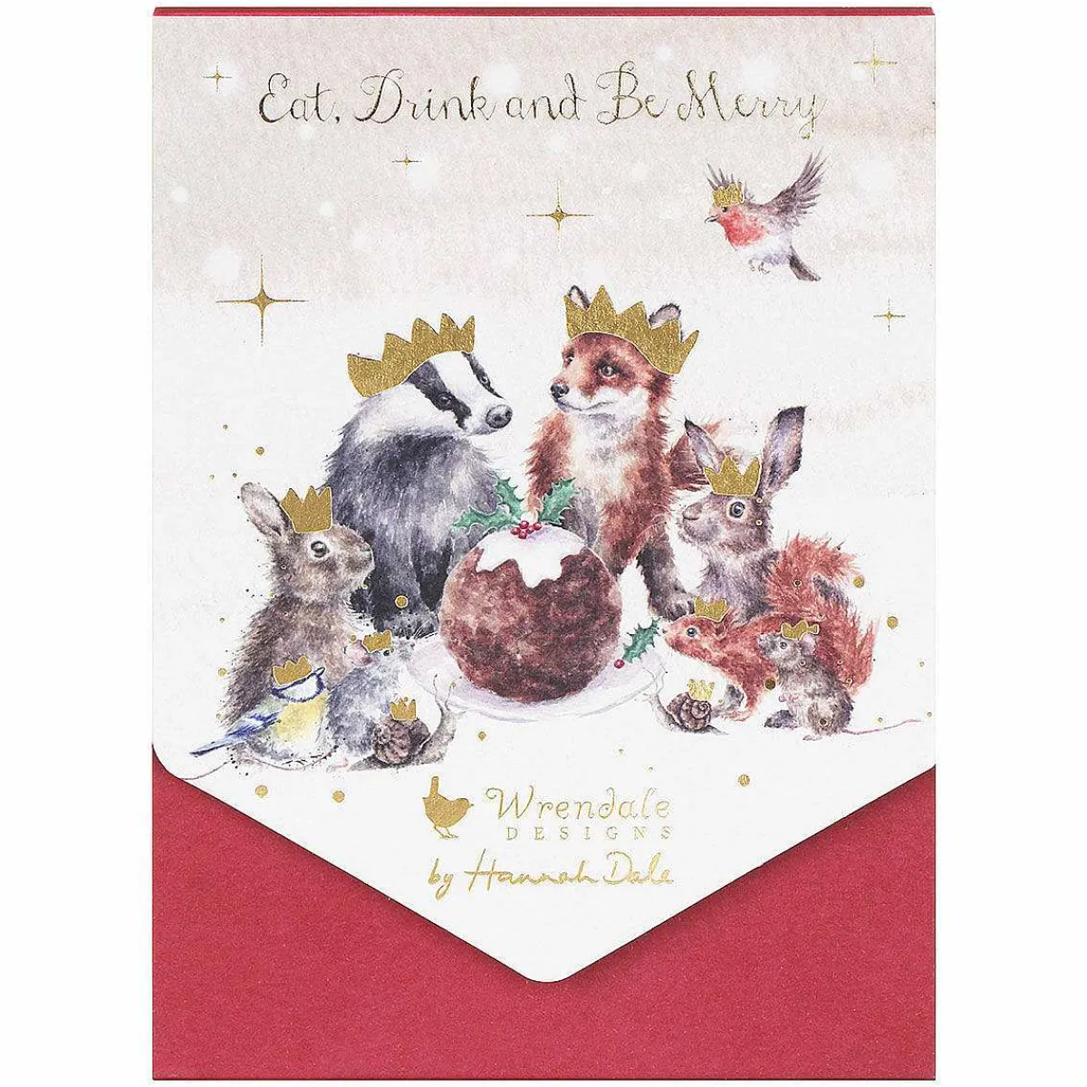 The Design Is Illustrated In The Watercolour Style That Is The Trademark Of Wrendale Designer Hannah Dale. This Is All Printed On Sustainably Sourced Textured Board. The Text Above The Illustration Reads ‘Eat, Drink And Be Merry’. These Stationery Pieces Are Neatly Packaged Inside A Cream And Red Wrendale Designs Folder Which Has A Velcro Closure To Keep Your Letters Safe And Organised.