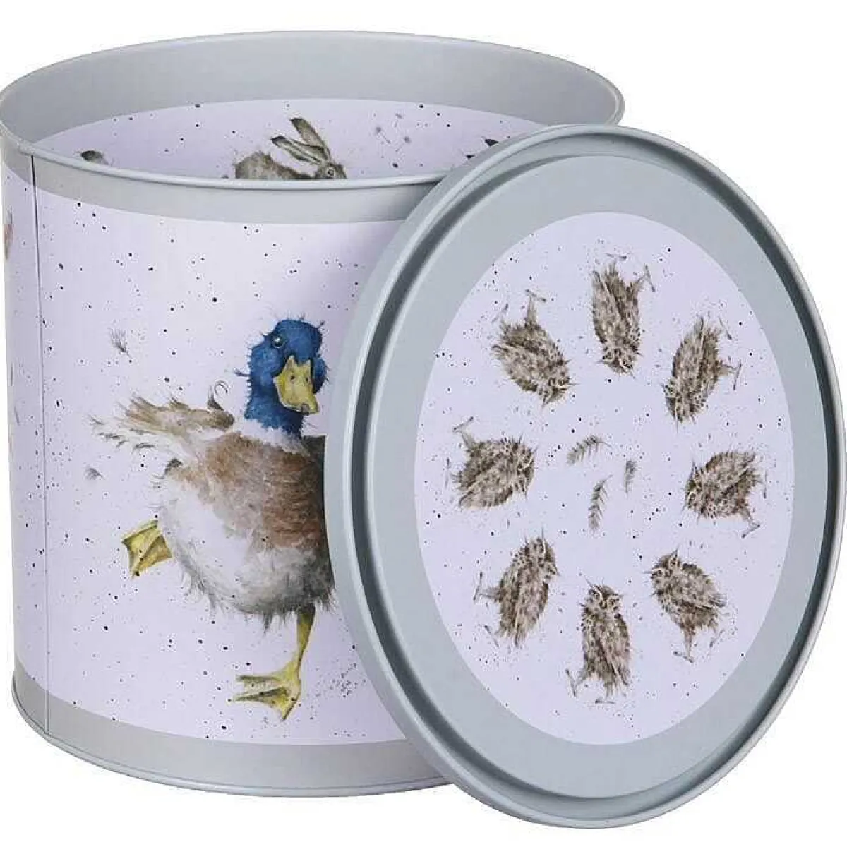 The Outside Of The Tin Features Illustrations Of Animals From The Award Winning Country Set Range. A Splendid Brown Hare Sits Tilting His Head To One Side With A Quizzical Look. Two Ducks, One With Wings Widespread Just Landing From Flight And The Other With His Webbed Feet Overlapping, Head To One Side With A Few Of His Feathers Fluttering Through The Air. A Slightly Dishevelled Tawny Owl Ruffling His Feathers, Causing Some To Fly Around Him. The Images Are Painted In Soft Hues, In The Expressive Style That Is Associated With Wrendale Designs.