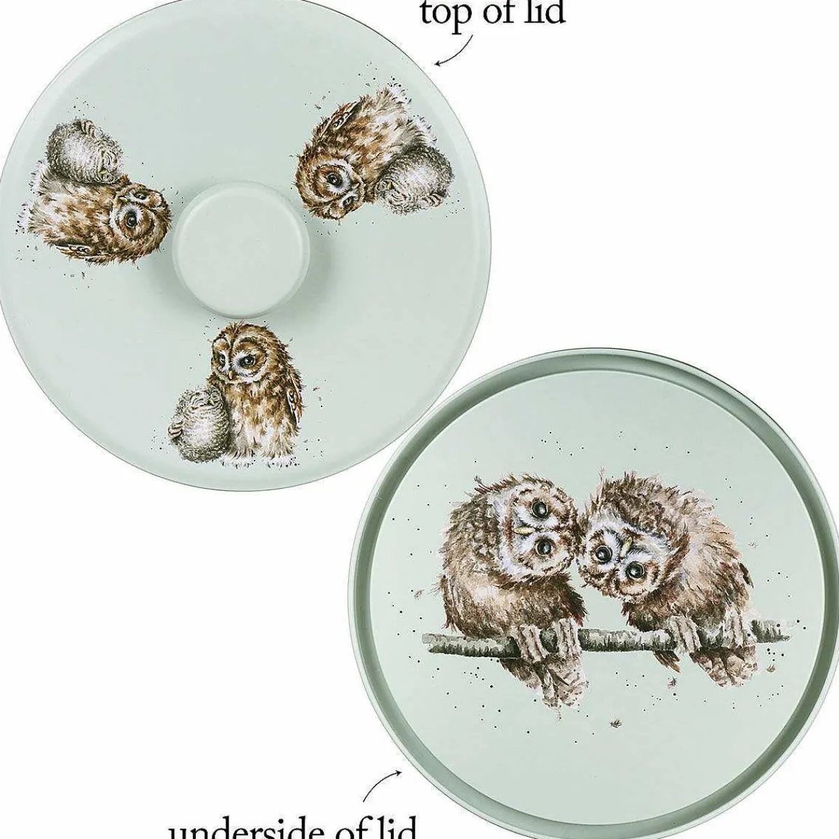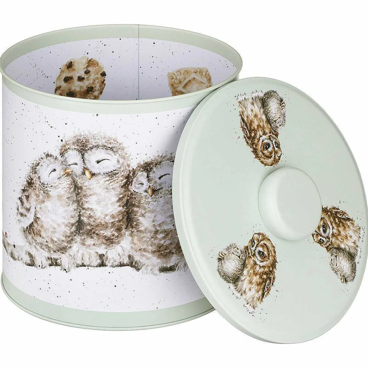 The Tin Features A Gorgeous Airtight Green Lid Which Adds A Pop Of Colour To The Design And There Is A Raised Knob Allowing For Easy Removal, And Access To The Contents. On The Lid There Are Three Illustrations, All Featuring A Happy Young Owlet Being Looked After By A Parent. The Interior Of The Tin Continues In The Theme Of Owls With Illustrations On The Base Of The Tin And The Underside Of The Lid. The Design Is Finished With Illustrated Biscuits Around The Interior Walls. All The Illustrations Are In A Wonderful Watercolour Style And Feature Black Speckle Details, In A Way That Is Synonymous With The Wrendale Designs Brand.