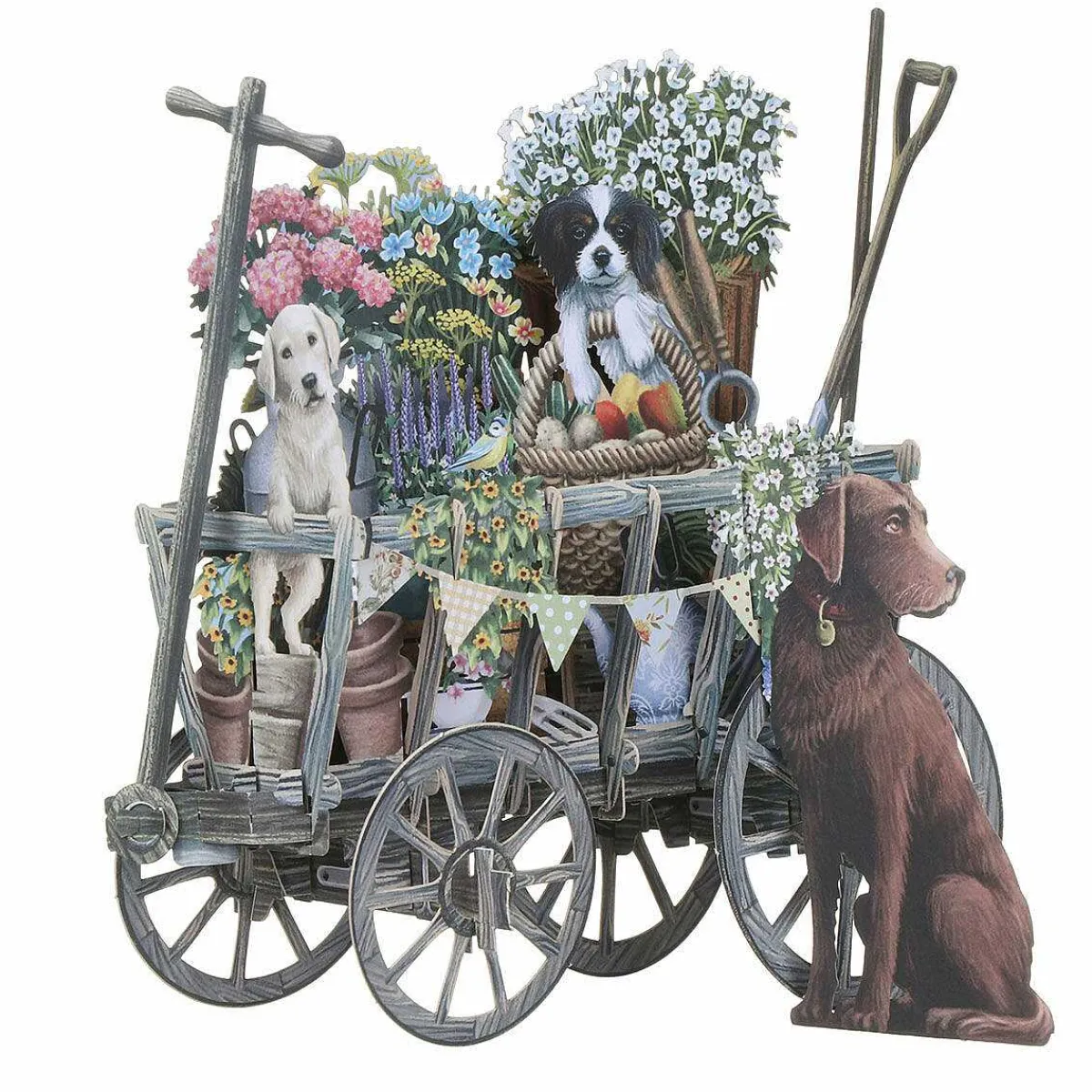 This Pop-Up 3D Card Is Beautifully Designed With Laser Cut, Intricate Details Bringing It To Life. It Depicts An Adorable Scene Of A Group Of Dogs Sat In And Amongst A Cart Full Of Colourful Flowers And Garden Tools! It Is Complete With Small Garden Birds Perched On The Edges Of The Cart.