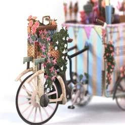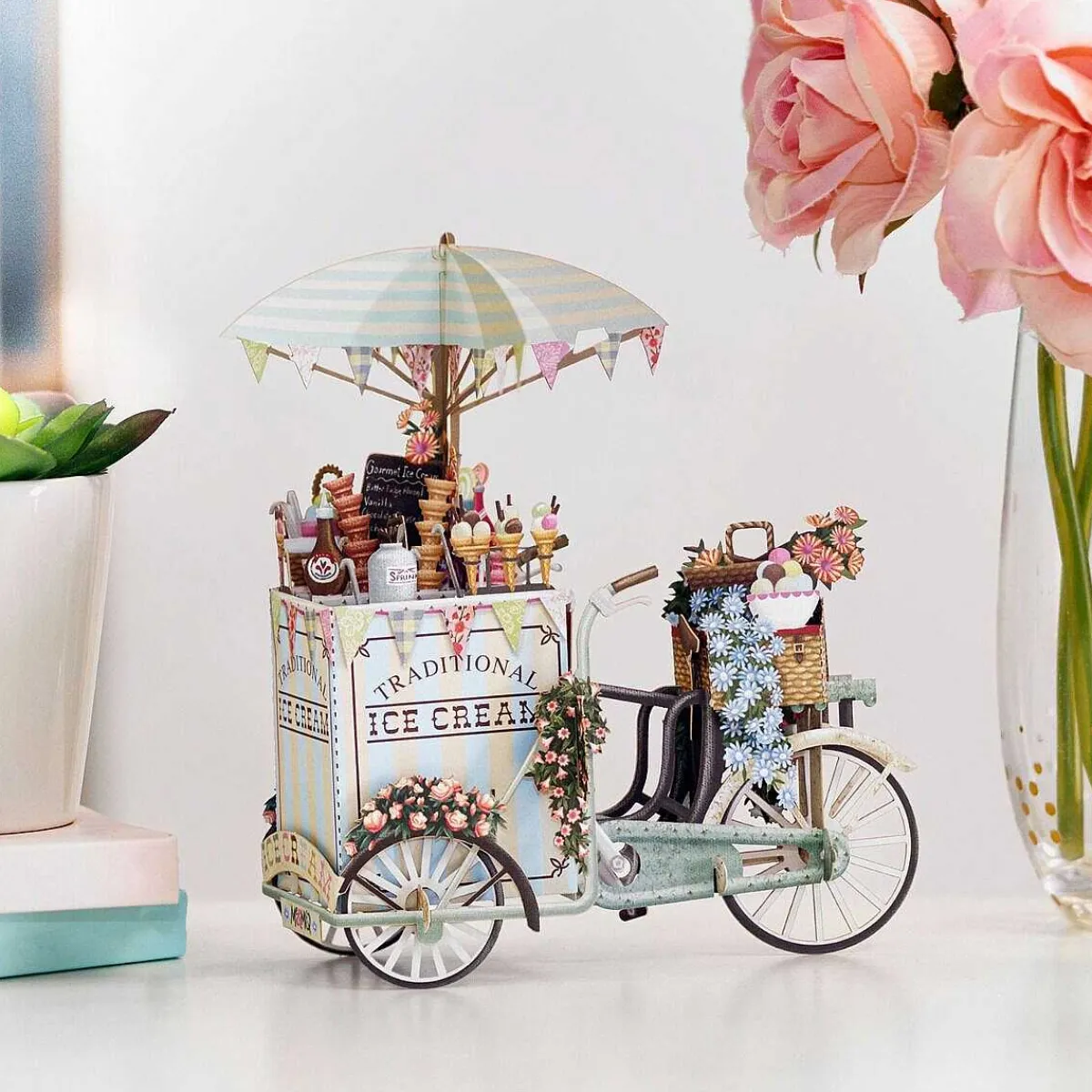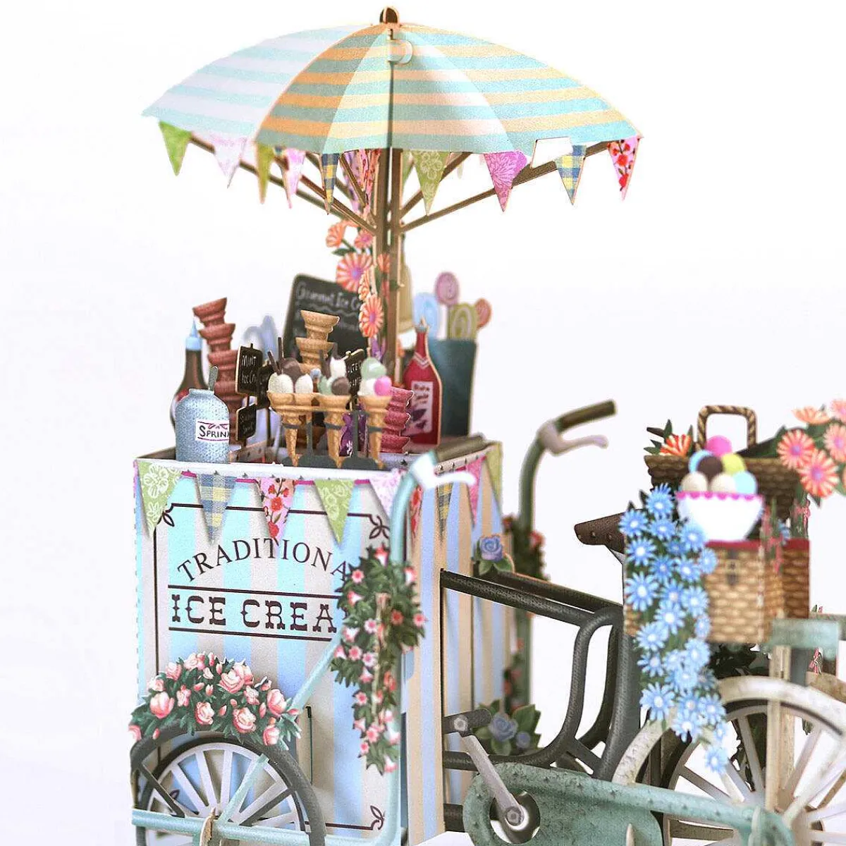 This Wonderful 3D Card Represents A Mobile Ice Cream Seller’S Bike, Complete With Cones, Scoops And Floral Decoration. The Three Wheeled Cart Is Painted In Pale Blue And Yellow, With A Matching Parasol To Keep The Sun Off The Ice Cream. Multi-Coloured Flowers In Pastel Shades Compliment The Colourful Fillings Displayed Within The Cones.