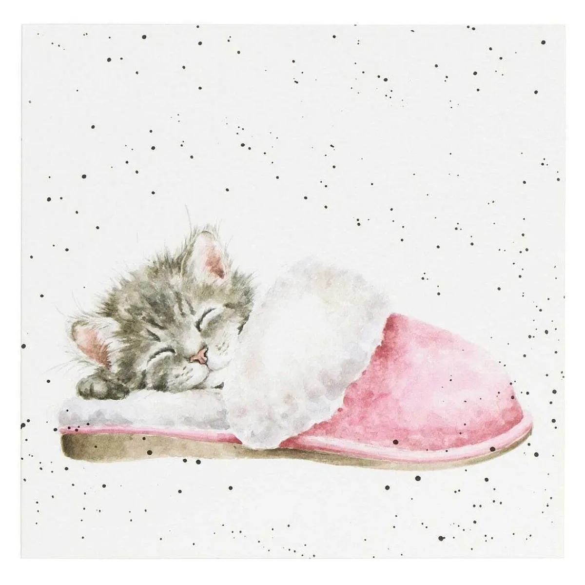 This Delightful Card Designed By Wrendale Features A Cute Fluffy Kitten Who Has Found A Warm Snuggly Slipper Which Is The Perfect Size For Him To Curl Up In And Have A Snooze! The Intricate Detail In This Card Painted With Water Colour Allows You To Really Capture The Mood Of This Cosy Card. Speckles Of Black Paint Surrounding The Image Gives The Classic Look Of A Wrendale Design.