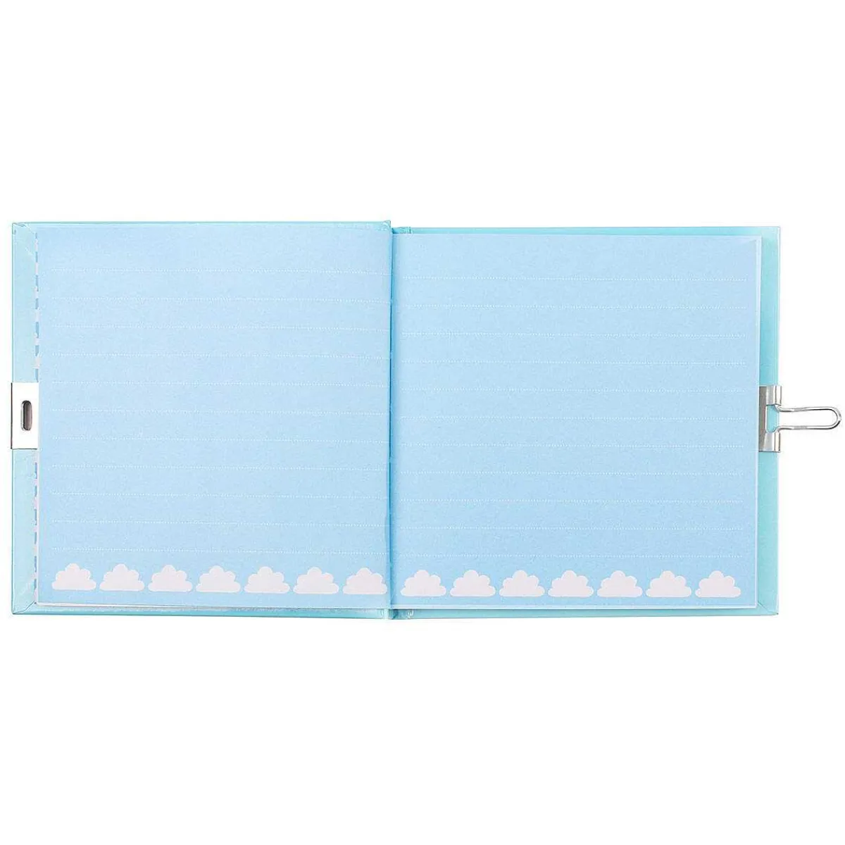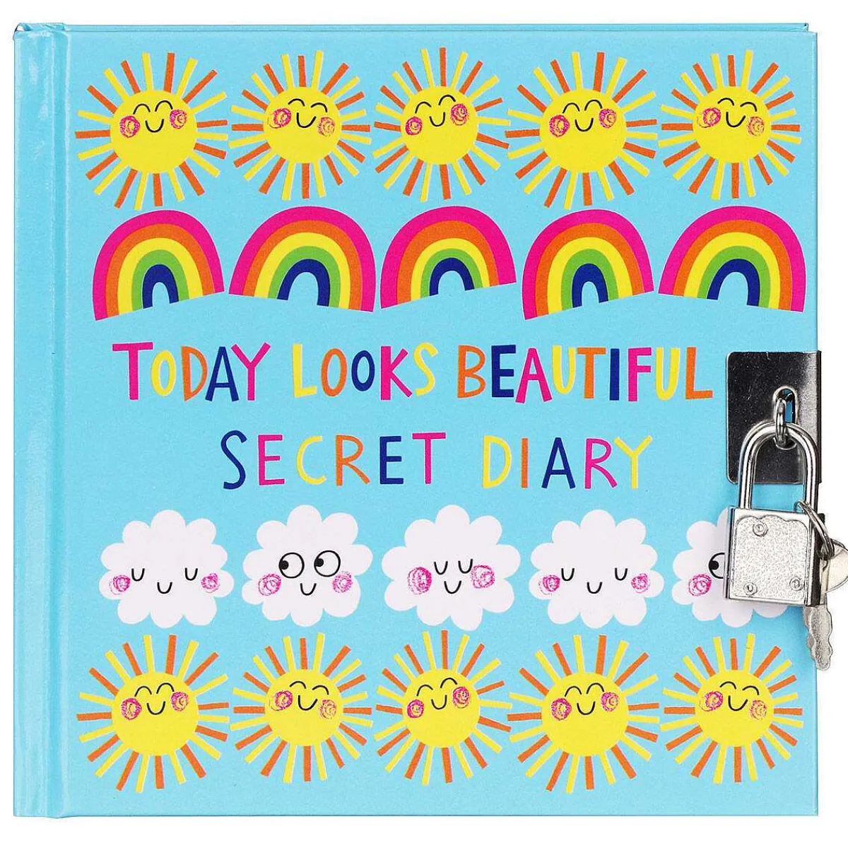 Printed On A Vibrant Blue Background Is An Illustration Of Weather, Cheerful Sunshines, Rainbows And Clouds Which Form A Repeat Pattern. Across The Middle In A Fun, Colourful Uppercase Font Is The Words ‘Today Looks Beautiful Secret Diary’. The Lined Pages Inside Are Pale Blue With A Small Illustration Of Clouds Across The Bottom. The Little Padlock Secures The Diary And Comes With Two Keys Just In Case You Lose One! On The Back The Patterned Weather Illustration Continues Finishing The Playful Design.