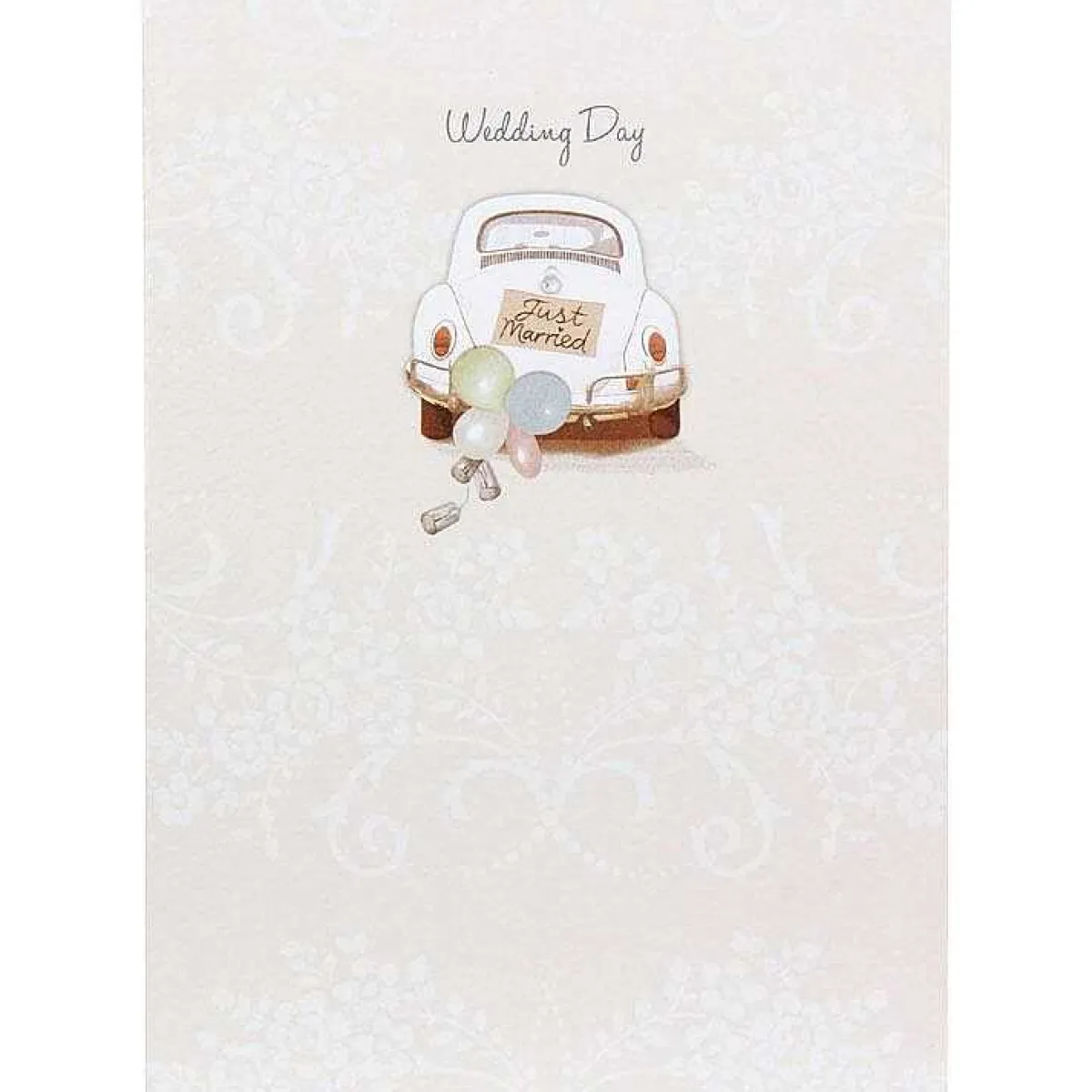 The Pretty Design Of This Card Features The Words ‘Wedding Day’ Above An Illustration Of A Car Bearing The Words ‘Just Married’.