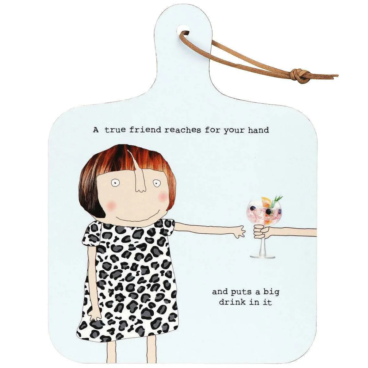 This Playful Mini Chopping Board Is Adorned With A Cheeky Illustration By Rosie Made A Thing. The Illustration Shows A Lady Reaching Out To Receive A Large Glass Of Her Favourite Drink. The Slogan Which Surrounds The Image Reads; ‘A True Friend Reaches For Your Hand, And Puts A Big Drink In It’. The Fun Design Continues On The Reverse With A Repeat Pattern Of A Delicious Beverage That Set Against A Pale Blue Background With The Rosie Made A Thing Logo At The Bottom.