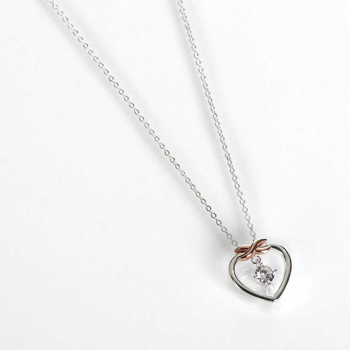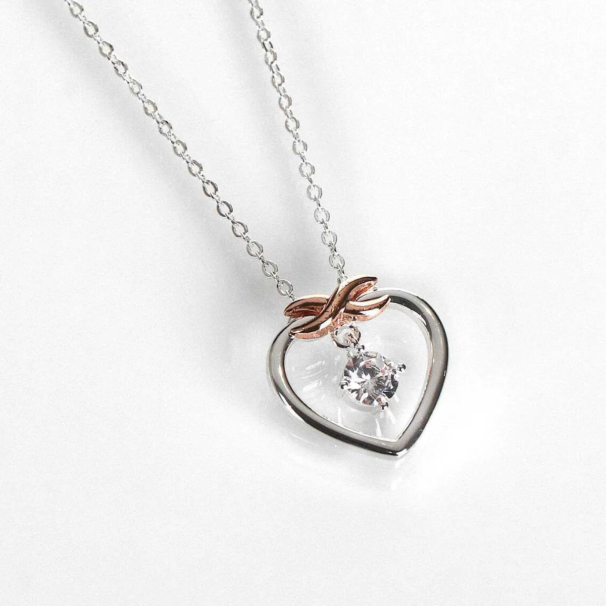 This Stunning Necklace Features A Fabulous, Polished Silver And Rose Gold Pendant. A Sleek Silver Heart Outline Is Topped With A Rose Gold Kiss, Hanging Inside The Heart Pendant Is A Single Clear Gemstone Which Will Sparkle As It Catches The Light. This Pendant Is Set Upon A Silver Chain Which Measures 45Cm In Length With A 5Cm Extension Chain And Fastens With A Spring Clasp.
