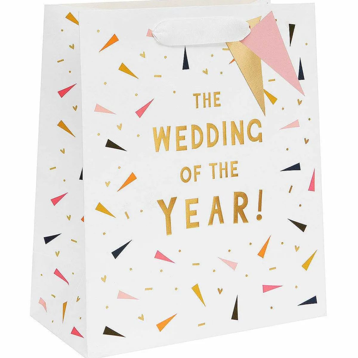 Made From Card, This Present Bag Is A Crisp White In Colour And Is Decorated With Falling Confetti, Dots And Hearts In Shades Of Orange, Pink, Yellow And Gold Foiling. The Text On The Front Of The Bag Is In A Bold, Gold Foiled Typeface And Reads;