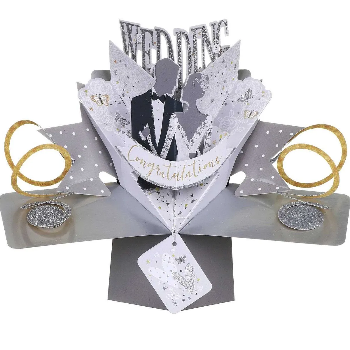 Not Just Any Card, This Pop-Up Greeting Card Jumps To Life From Its Envelope! This Card Is Perfect For Your Friend Or Family Members Special Day As Well As Being A Keepsake They Can Treasure. In The Middle Of The Card Is A Silhouette Of A Bride And Groom With A Banner Saying Congratulations And Above That The Word Wedding In Silver Text.