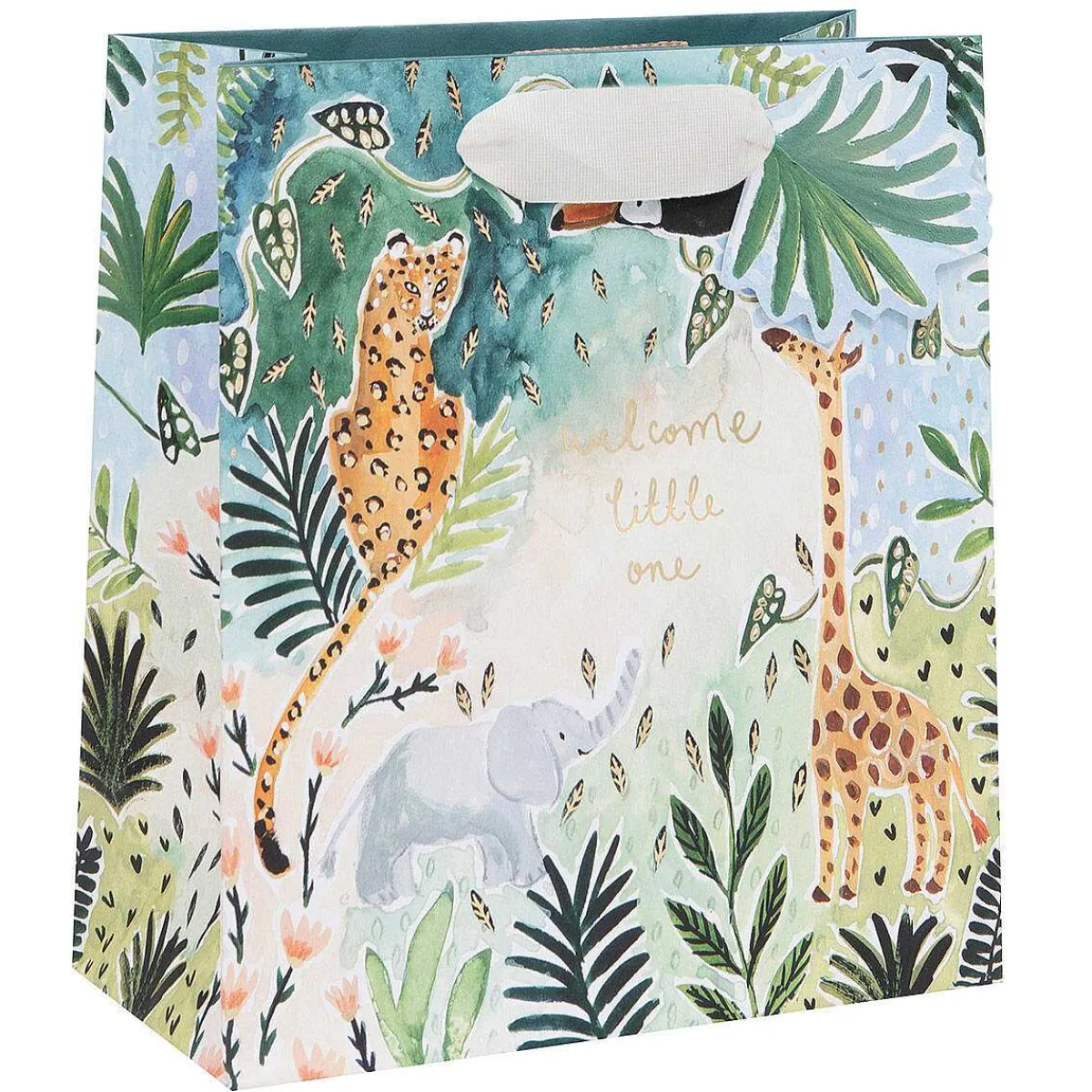 Give Your Gift In A Stylish Bag From Glick! This Playful Gift Bag Is Decorated With An Adorable Painted Illustration Of Wild Animals Including Elephant, Leopard, Giraffe And Toucan All Set Amongst A Jungle Themed Background With Green Foliage Complete With Golden Highlights Which Add A Touch Of Luxury. Across The Middle In A Clearing Of The Jungle Is The Title ‘Welcome Little One’ Written In A Stylish Lowercase Font In Shimmering Gold.