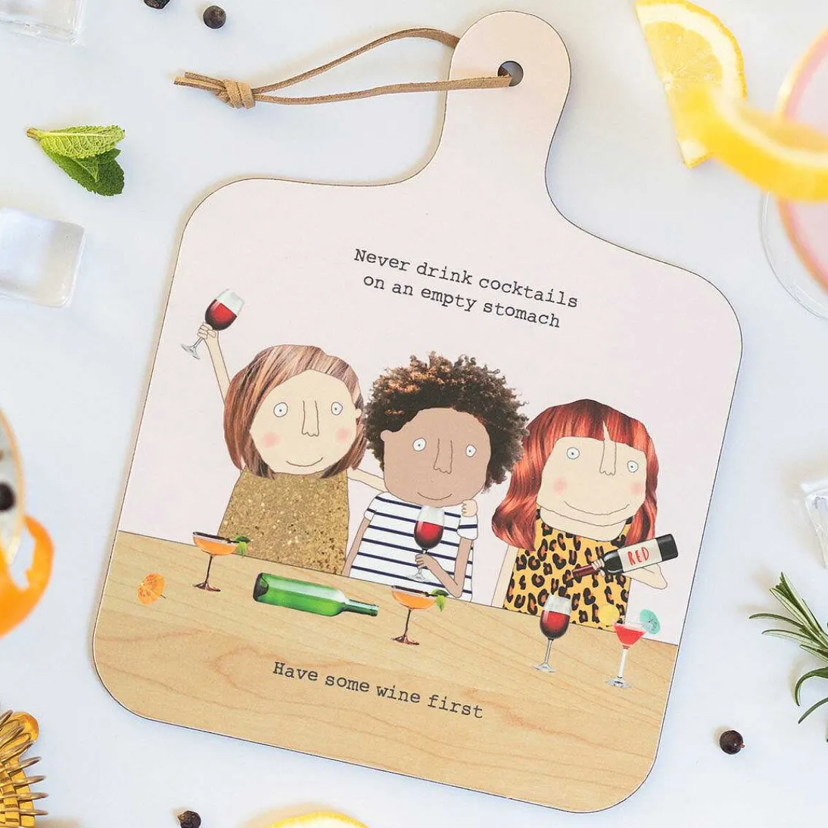 This Playful Mini Chopping Board Is Adorned With A Cheeky Illustration By Rosie Made A Thing. The Illustration Shows Three Friends Enjoying A Bottle Of Red Wine And Some Cocktails. The Slogan Which Surrounds The Image Reads; ‘Never Drink Cocktails On An Empty Stomach Have Some Wine First’. The Fun Design Continues On The Reverse With A Repeat Pattern Of A Delicious Cocktail That Set Against A Pale Pink Background With The Rosie Made A Thing Logo At The Bottom.