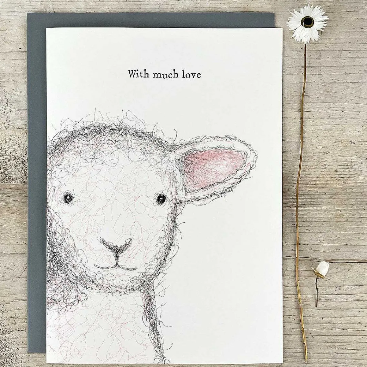 The Card Features An Illustration Of An Adorable Lamb With Fluffy Fur And Large Ears. With Text Above The Image That Reads ‘With Much Love’ Set Against A Cream Background.