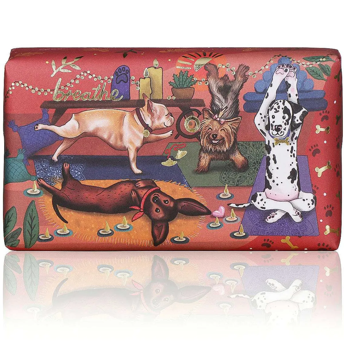 Massage Your Skin With This 190G Scented Vegetable Soap Which Is Enriched With Shea Butter And Is Made With Pure Vegetable Oils For A Rich And Sumptuous Lather. The Fantastic Aroma Features Notes Of Violet, Apple, Lilac And Peach Which Is Complimented The Fun Design On The Paper, Fully Recyclable Packaging. The Design Features A Group Of Dogs Doing Yoga Together. This Is Set Against The Beautiful Red Background And The Text On The Wrapper Reads ‘Stay Pawsitive’.