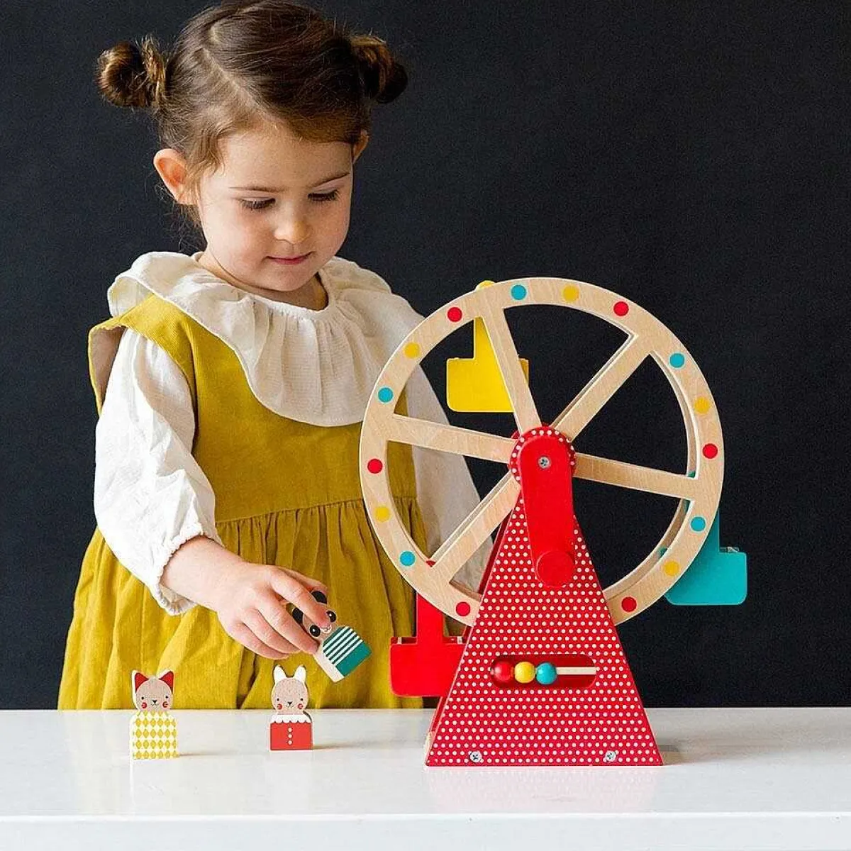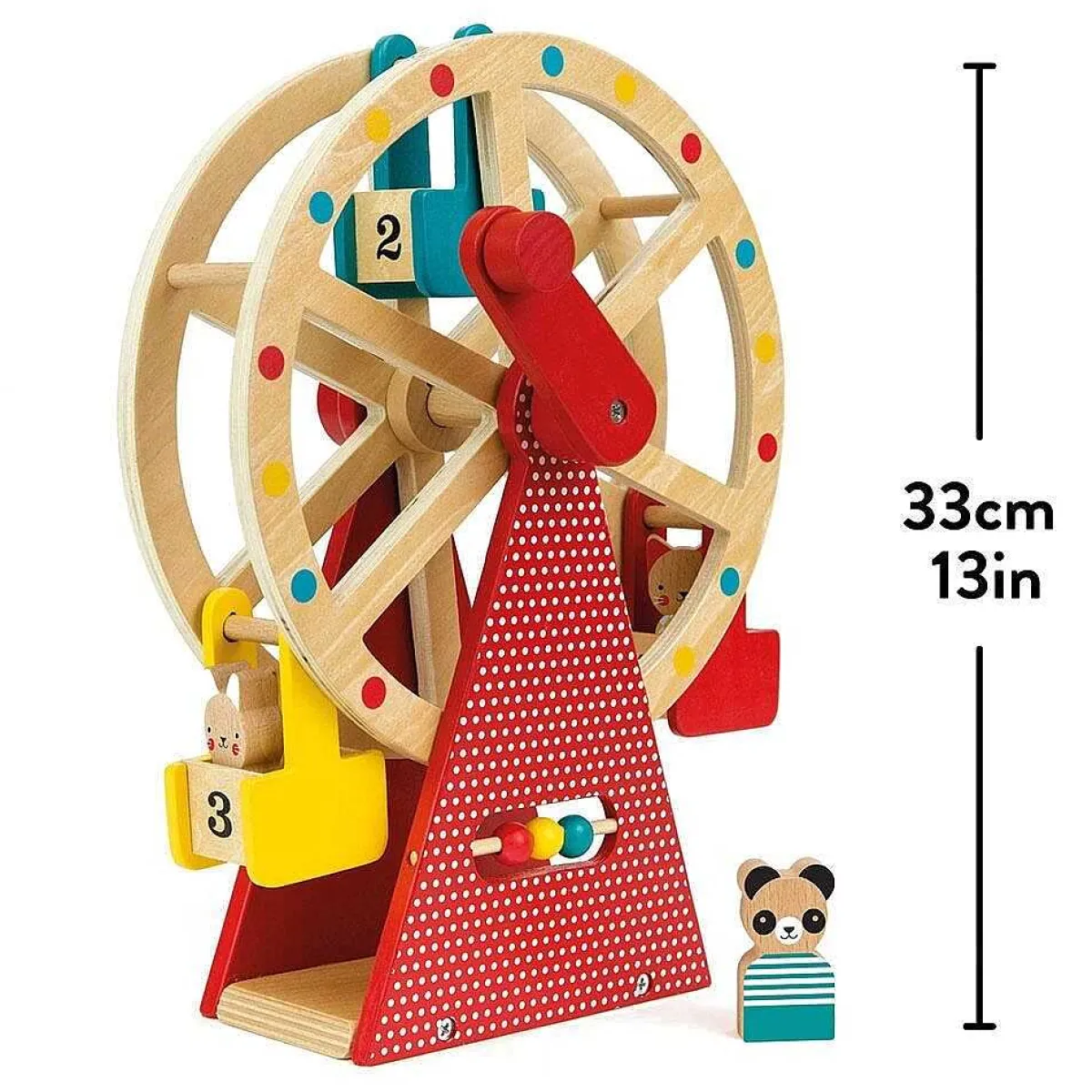 Encourage Creative Play And Storytelling When Taking The Three Animal Characters; Panda, Rabbit And Cat For A Ride On The Toy Ferris Wheel As You Turn The Red Chunky Handle. The Figurines Are Wooden And Are Made Using Solid Beech Wood. There Is Also A Small Colourful Abacus On The Front To Help With Counting Up To Three.