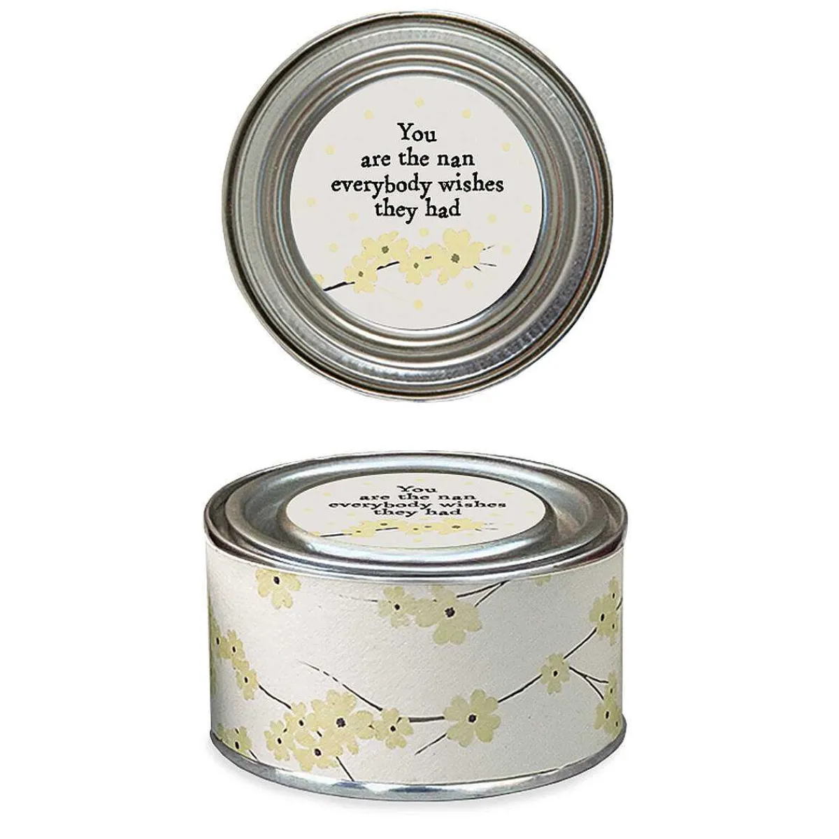The Message On The Lid Reads ‘You Are The Nan Everybody Wishes They Had’. The Tin Is Decorated In Branches With Blossoming Flowers Set Against A Cream Background. This Candle Is Scented With A Refreshing Scent Of Lemon And Thyme.