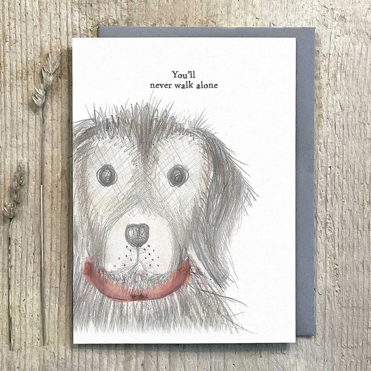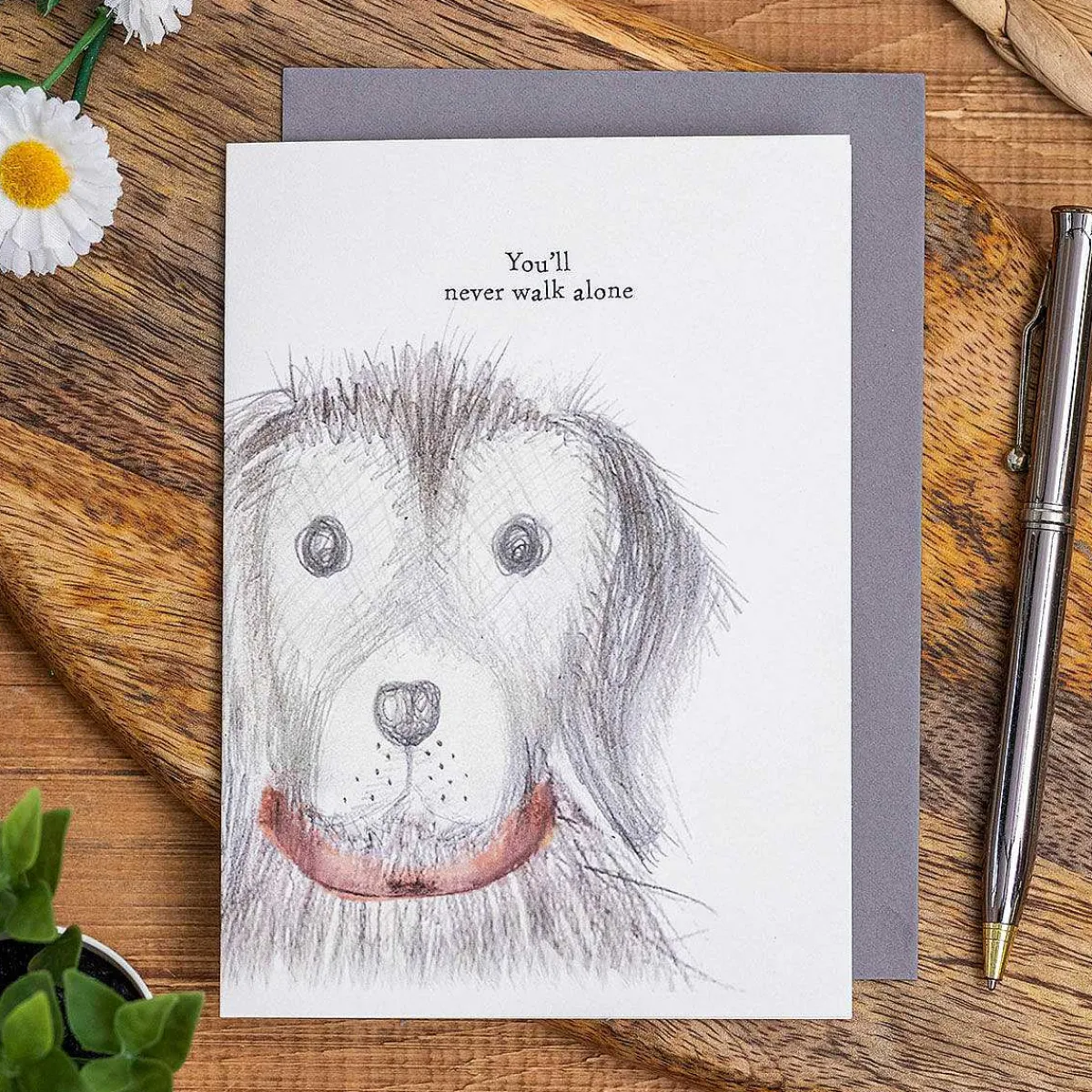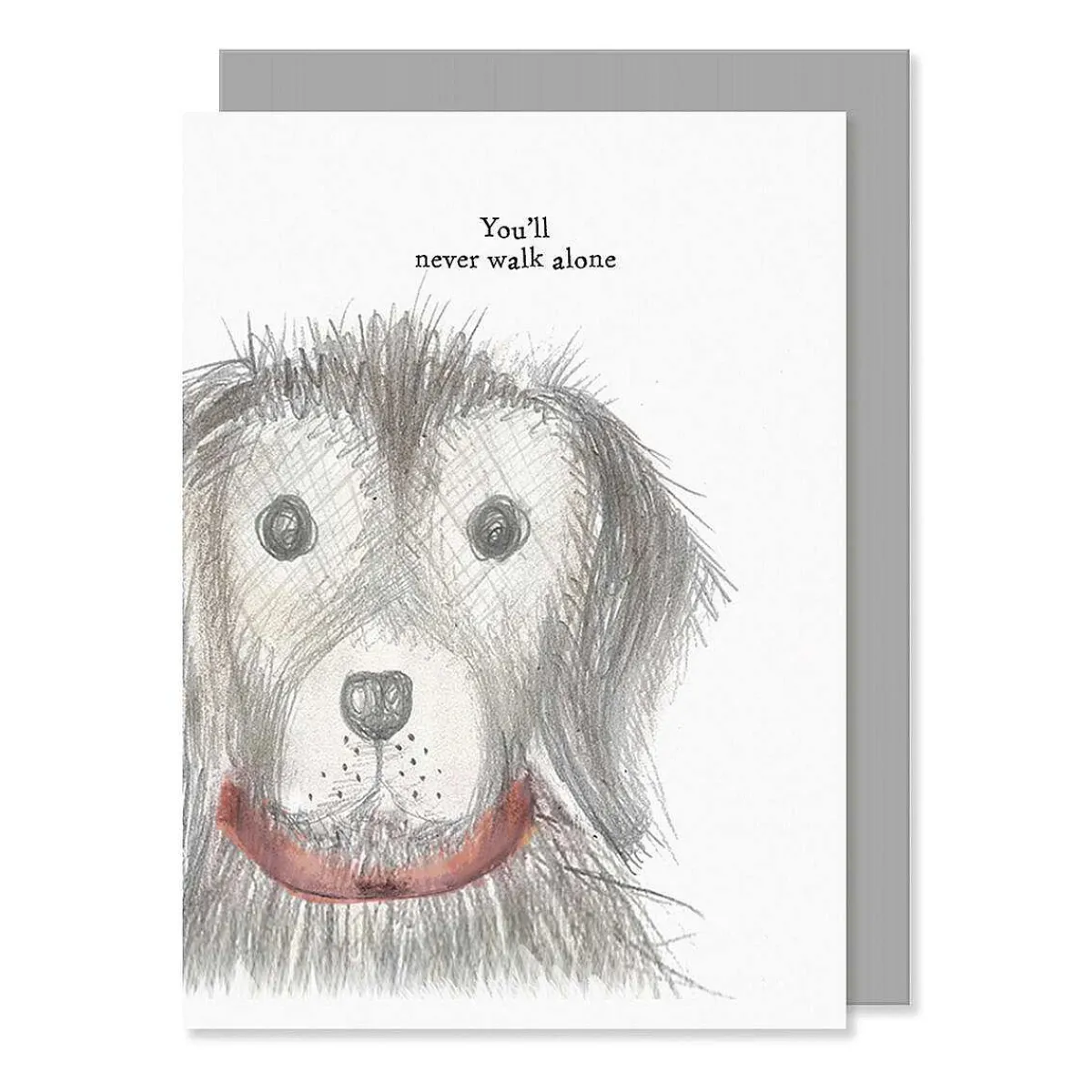 This Tasteful White Coloured Card Displays An Image Of A Large Scruffy Dog. The Card Has Text Above The Image Which Reads ‘You’Ll Never Walk Alone’ Written In The Traditional East Of India Style Font.